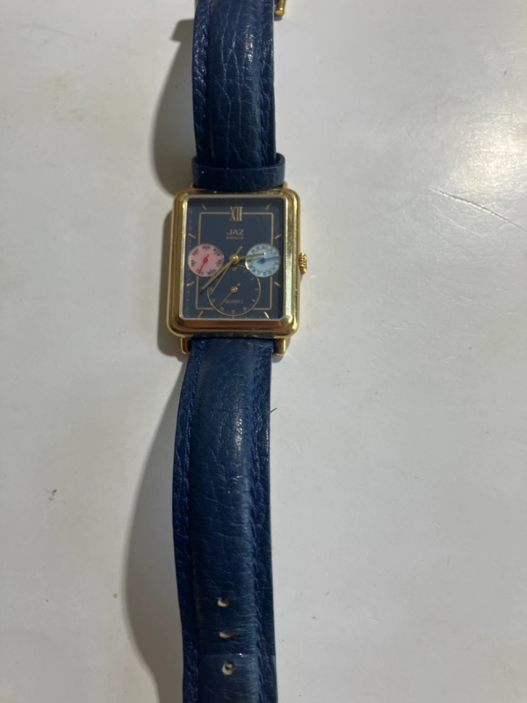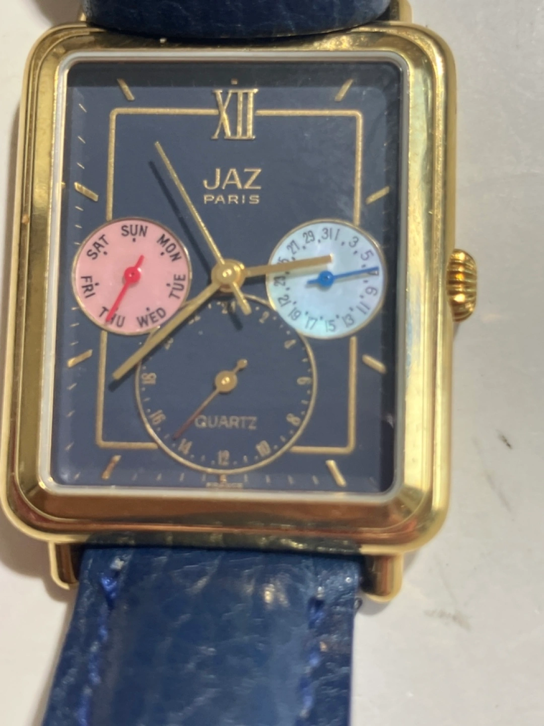 Rectangular gold-toned case. Dark blue leather band. Quartz movement. Day, date, 24 h sundials. Assembled in France. Model number: NSC063.