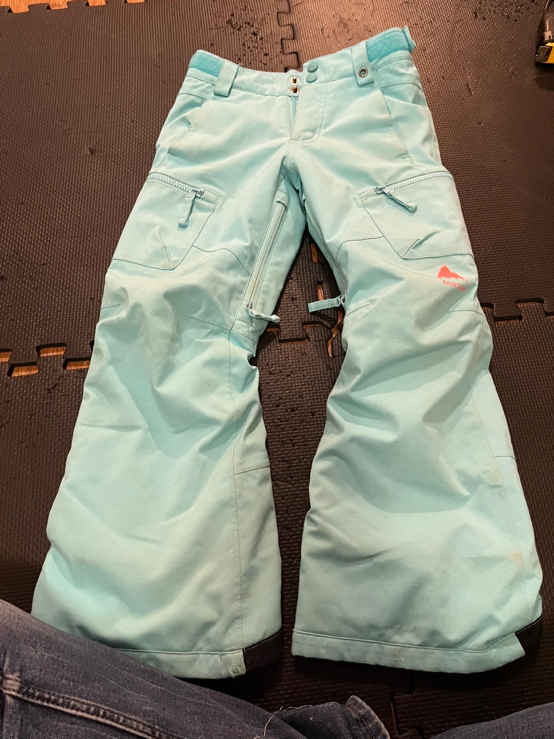 Girls' Burton snow pants. Size XS. Light blue colour. Features multiple pockets and zippered closures. Good for snowboarding or skiing.