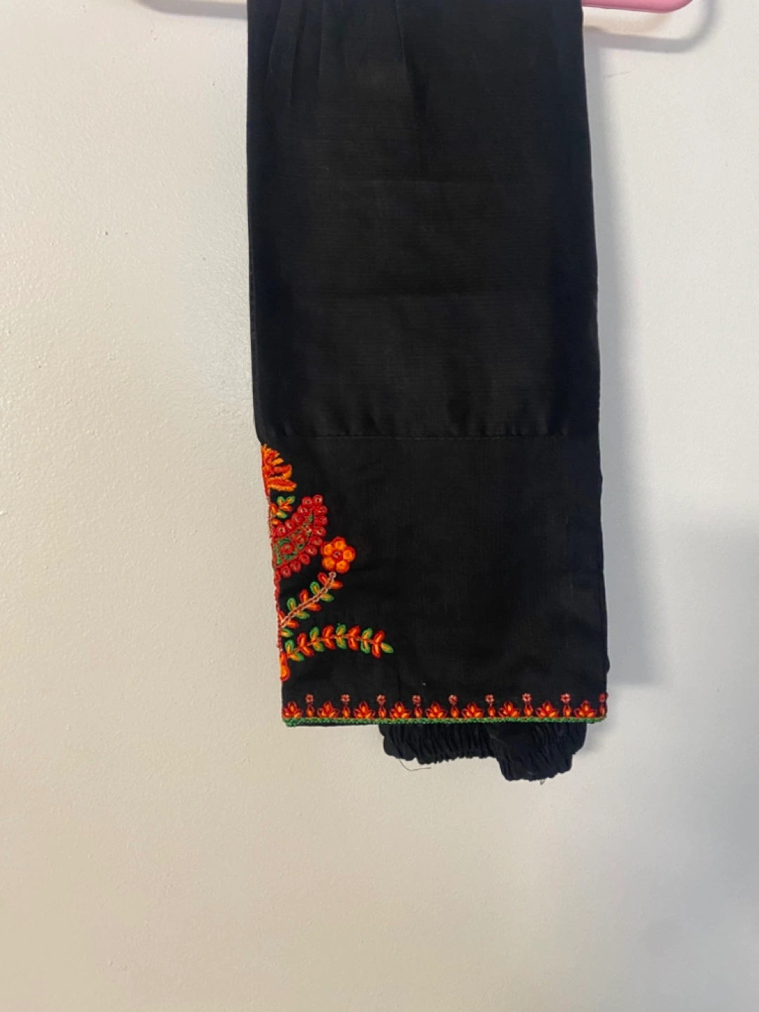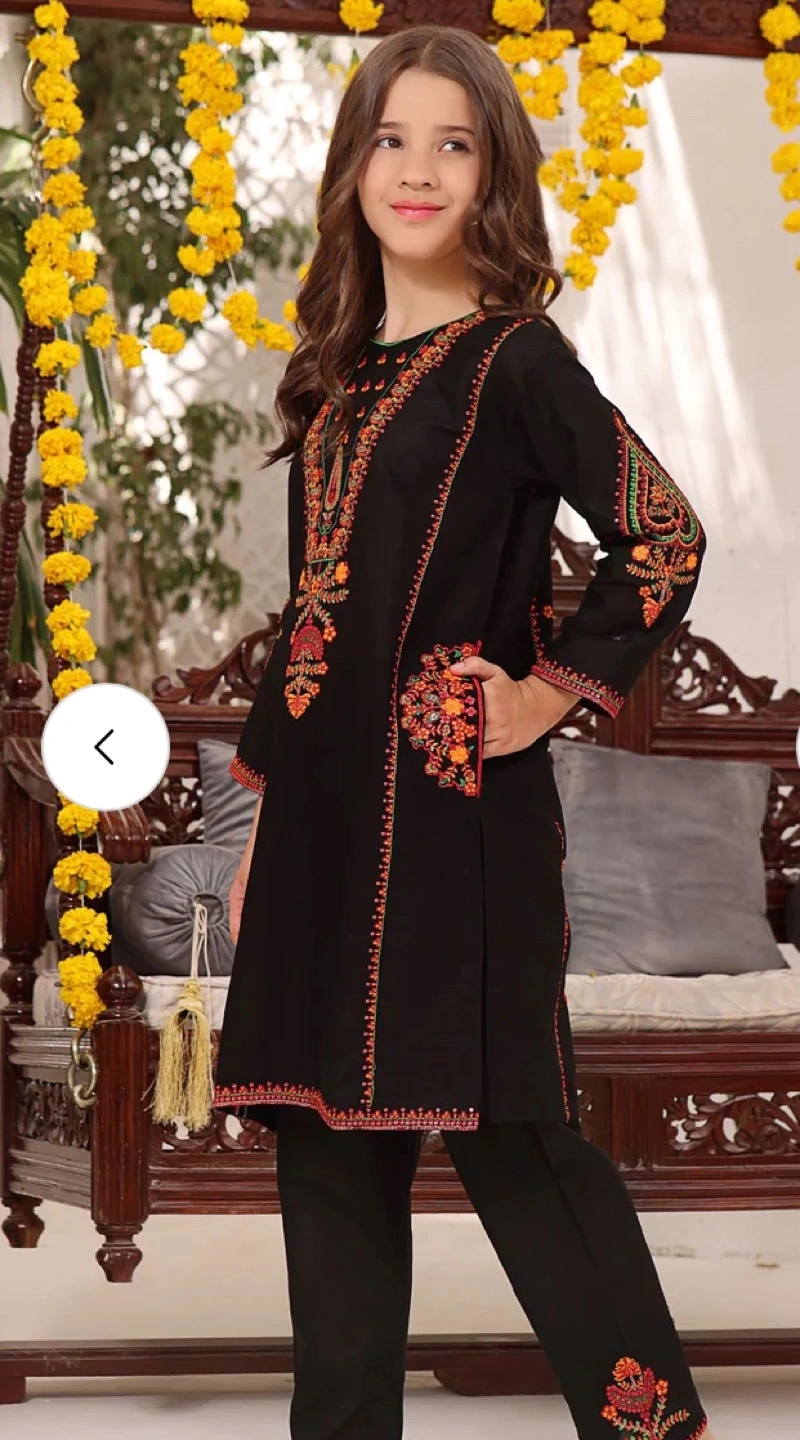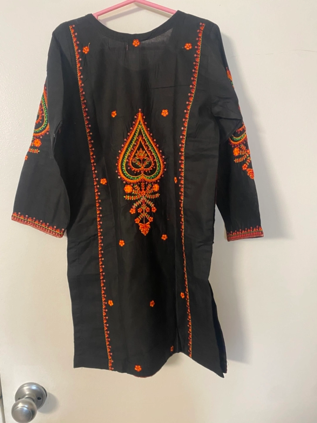 Beautiful black shalwar kameez. Intricate embroidery detail. Three-quarter sleeves. Matching trousers. Suitable for special occasions.