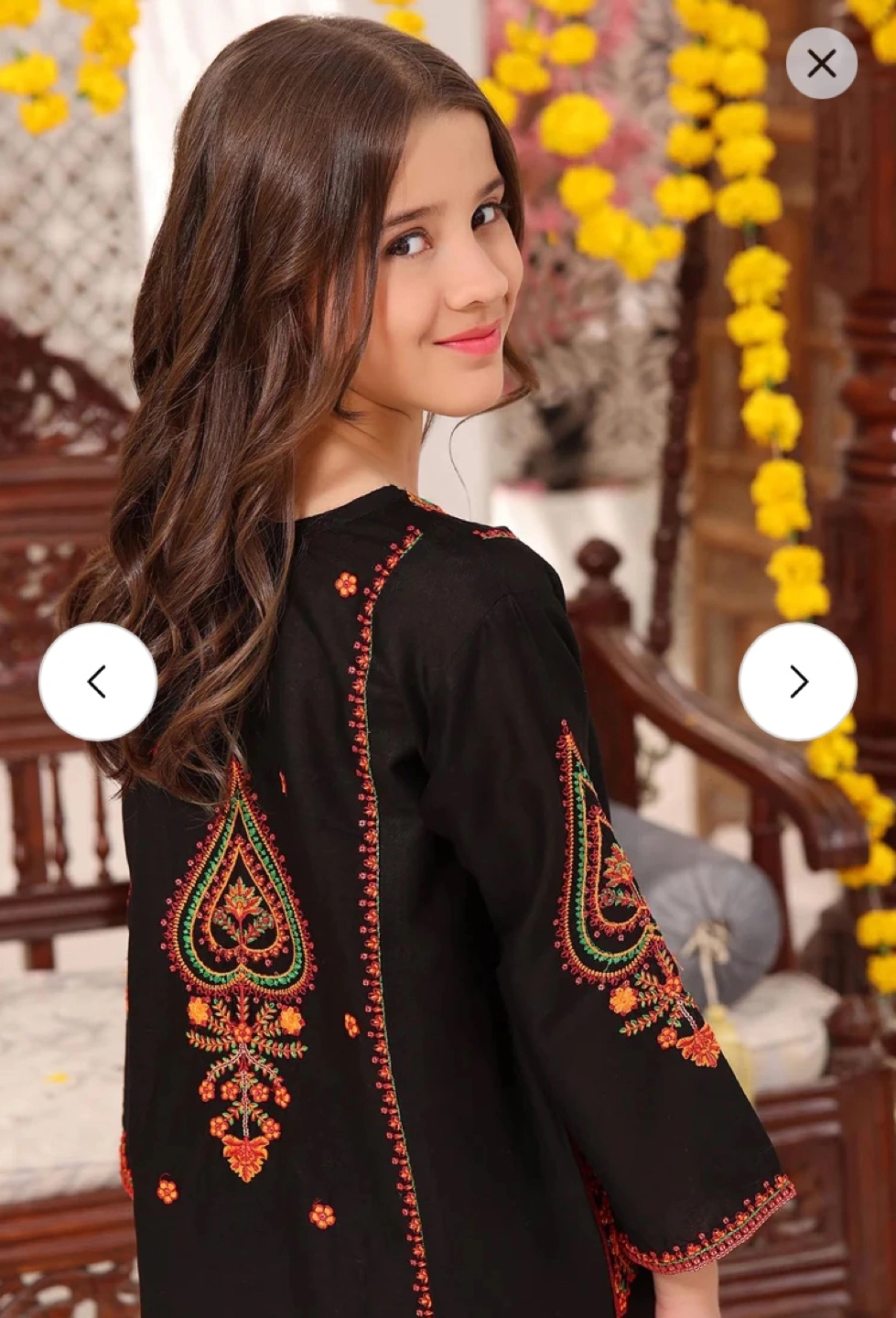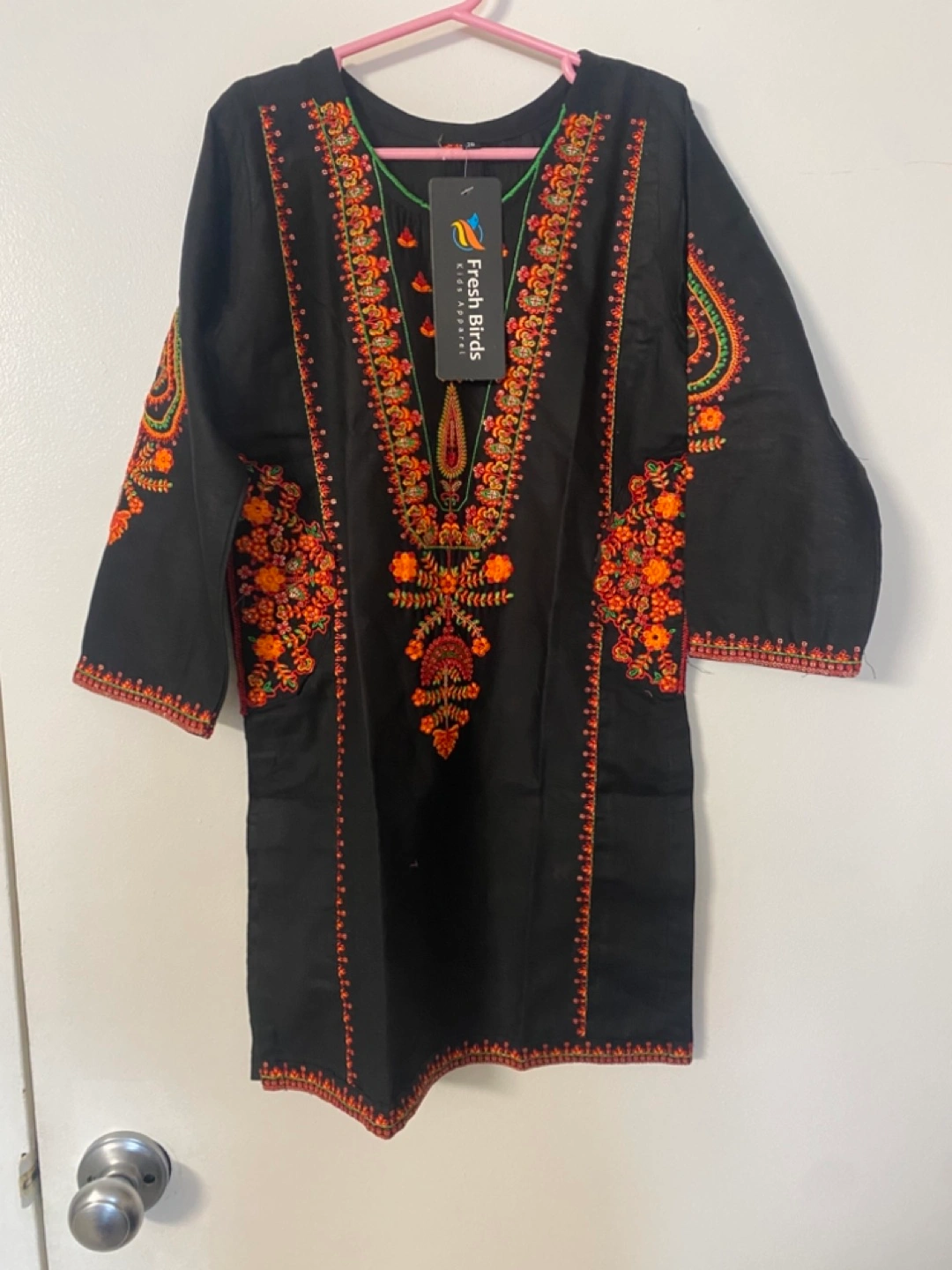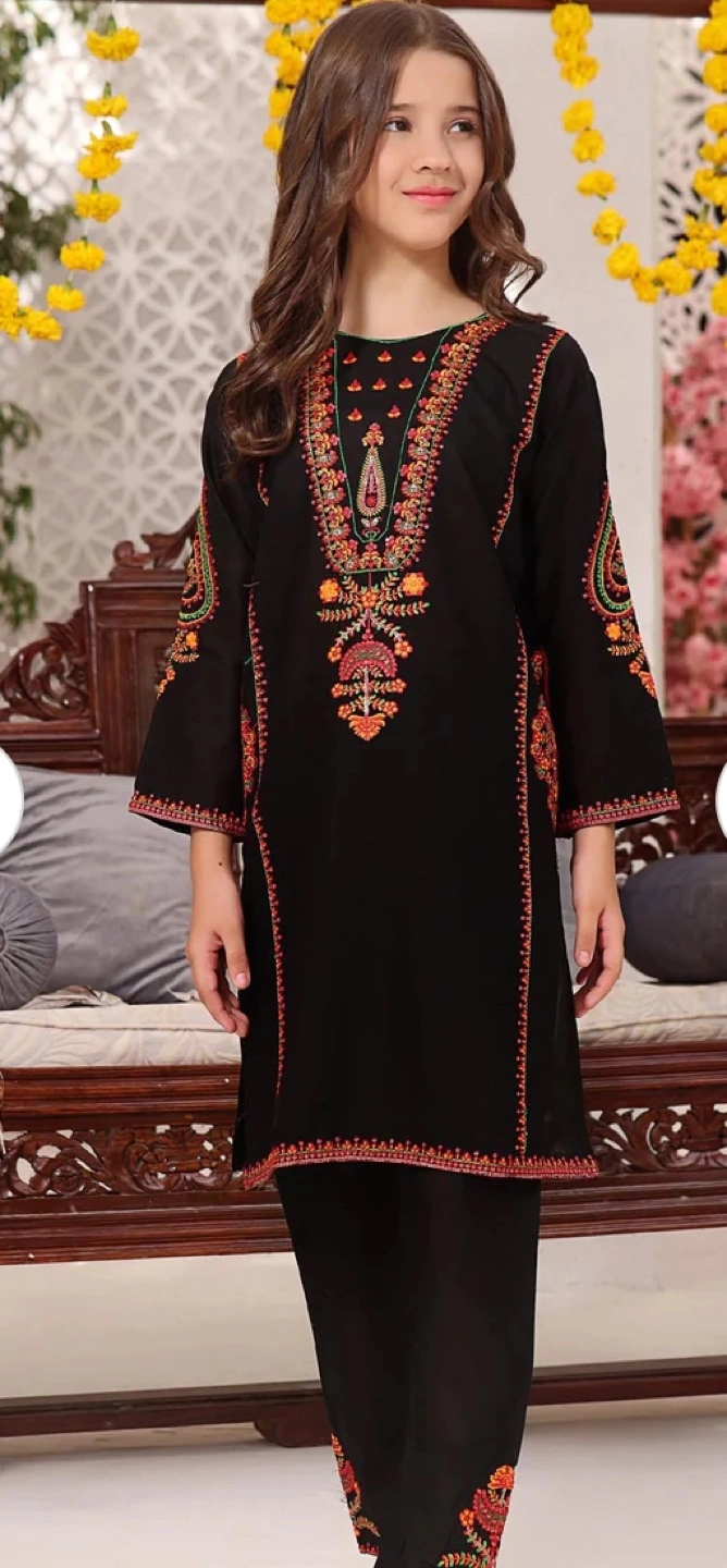 Beautiful black shalwar kameez. Intricate embroidery detail. Three-quarter sleeves. Matching trousers. Suitable for special occasions.