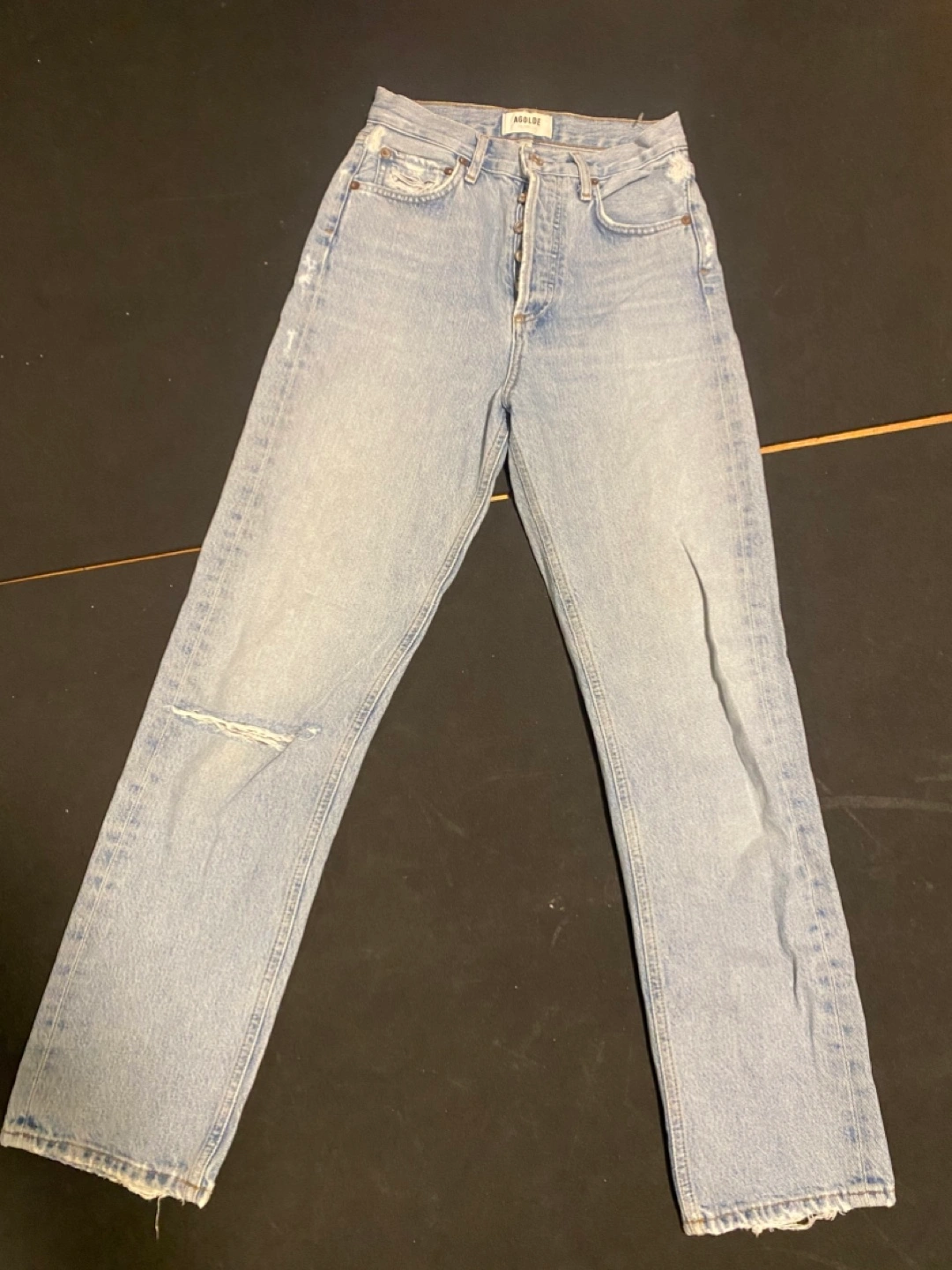 Light wash denim jeans. High waisted, straight leg. Button fly. Minor distressing. Size 22.