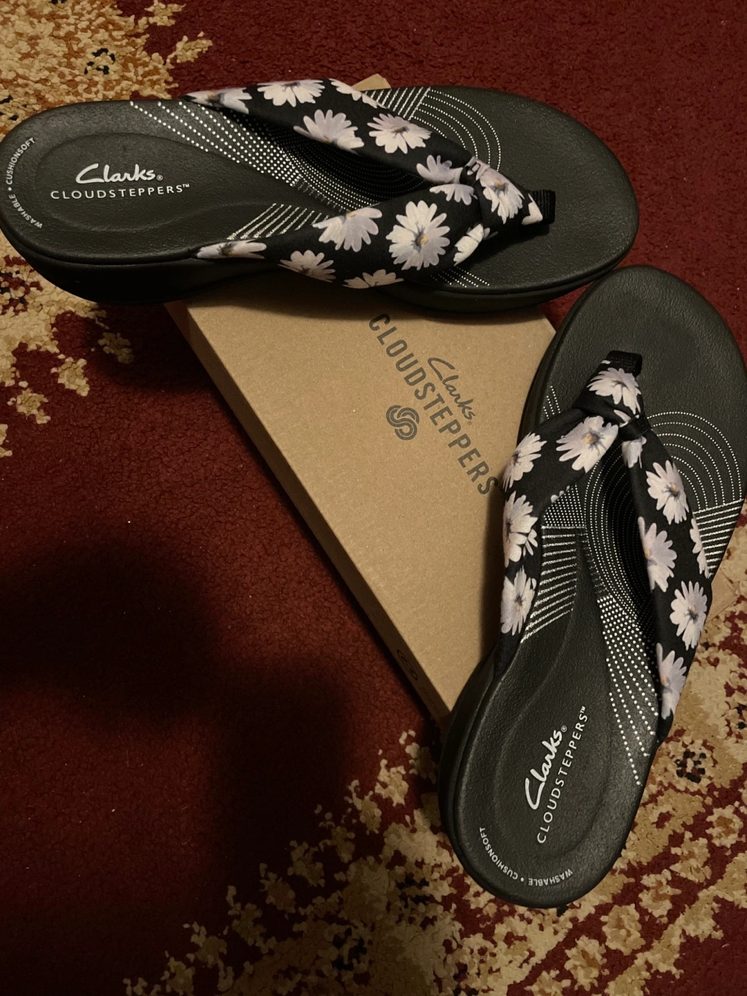 Women's Clarks Cloudsteppers flip-flops. Black with white daisy print. Cushion soft and washable.