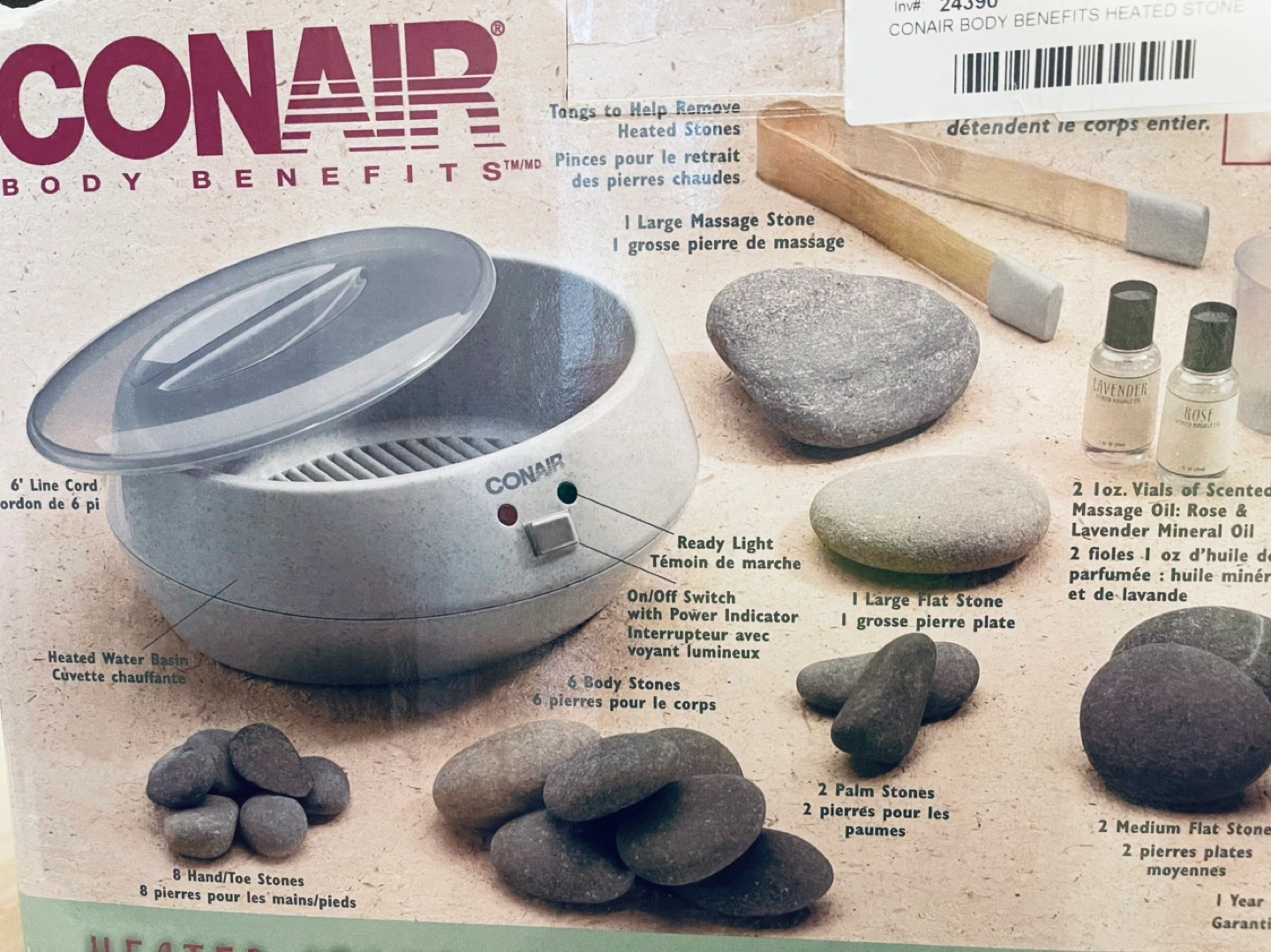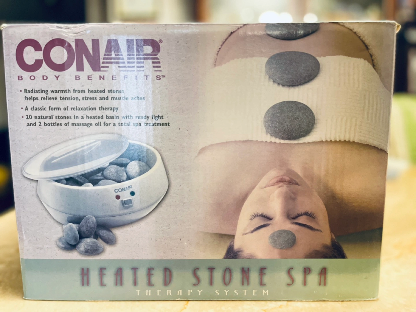 Conair heated stone spa. Includes 20 natural stones, a heated basin, Classic relaxation therapy. Reduces tension, stress, and muscle aches.