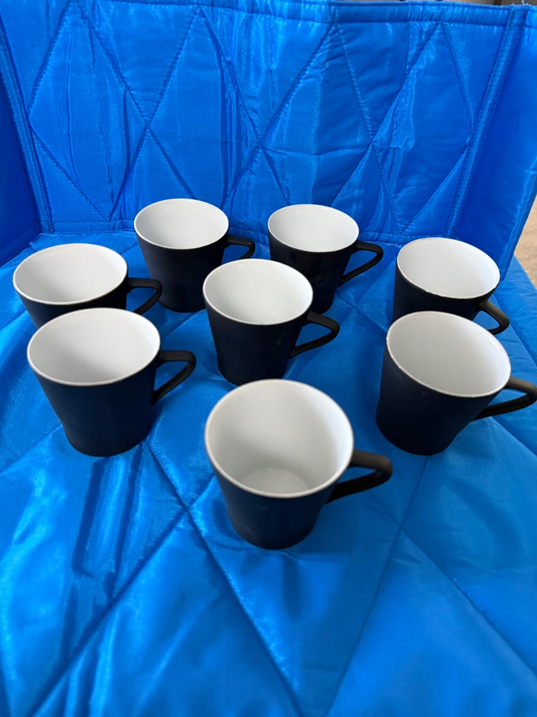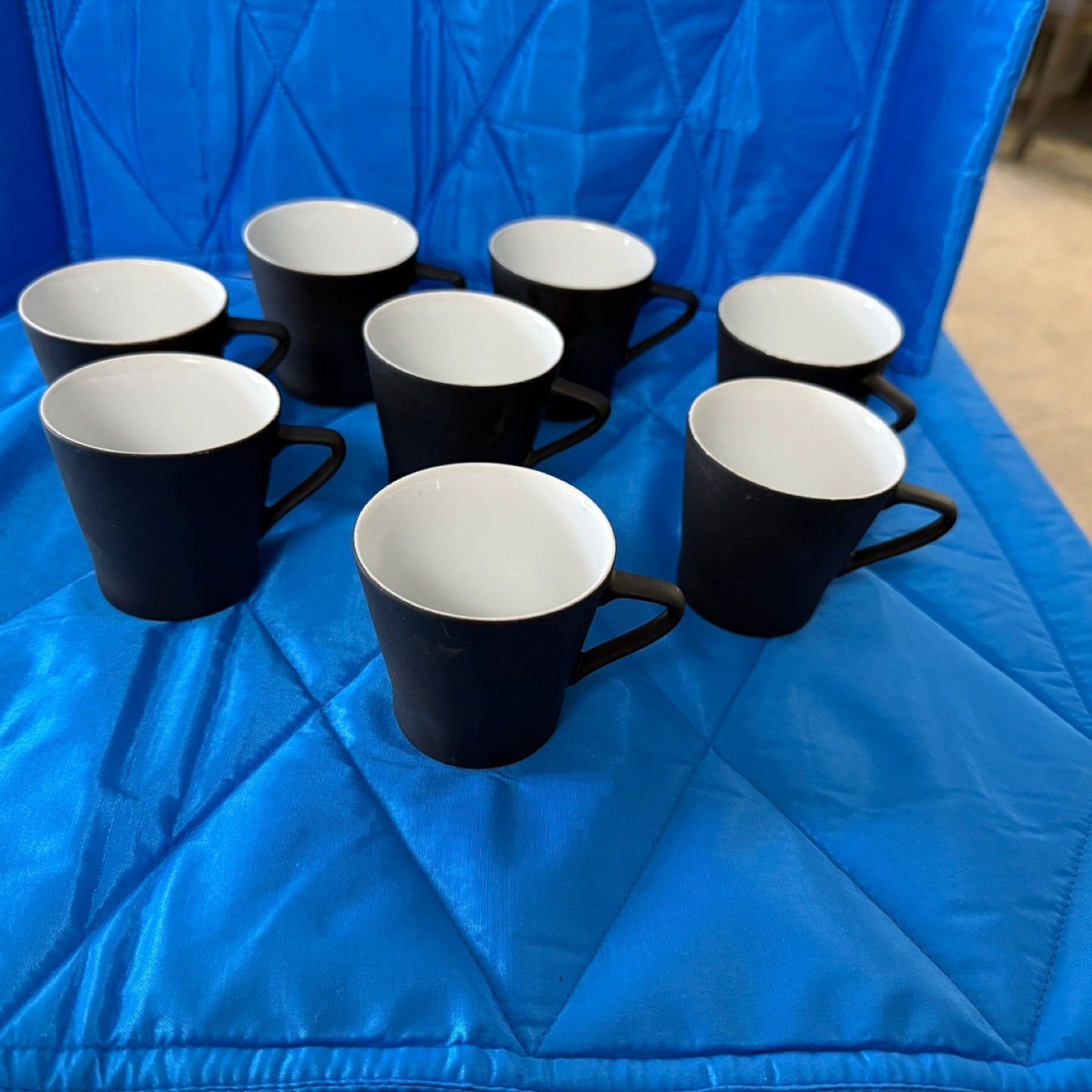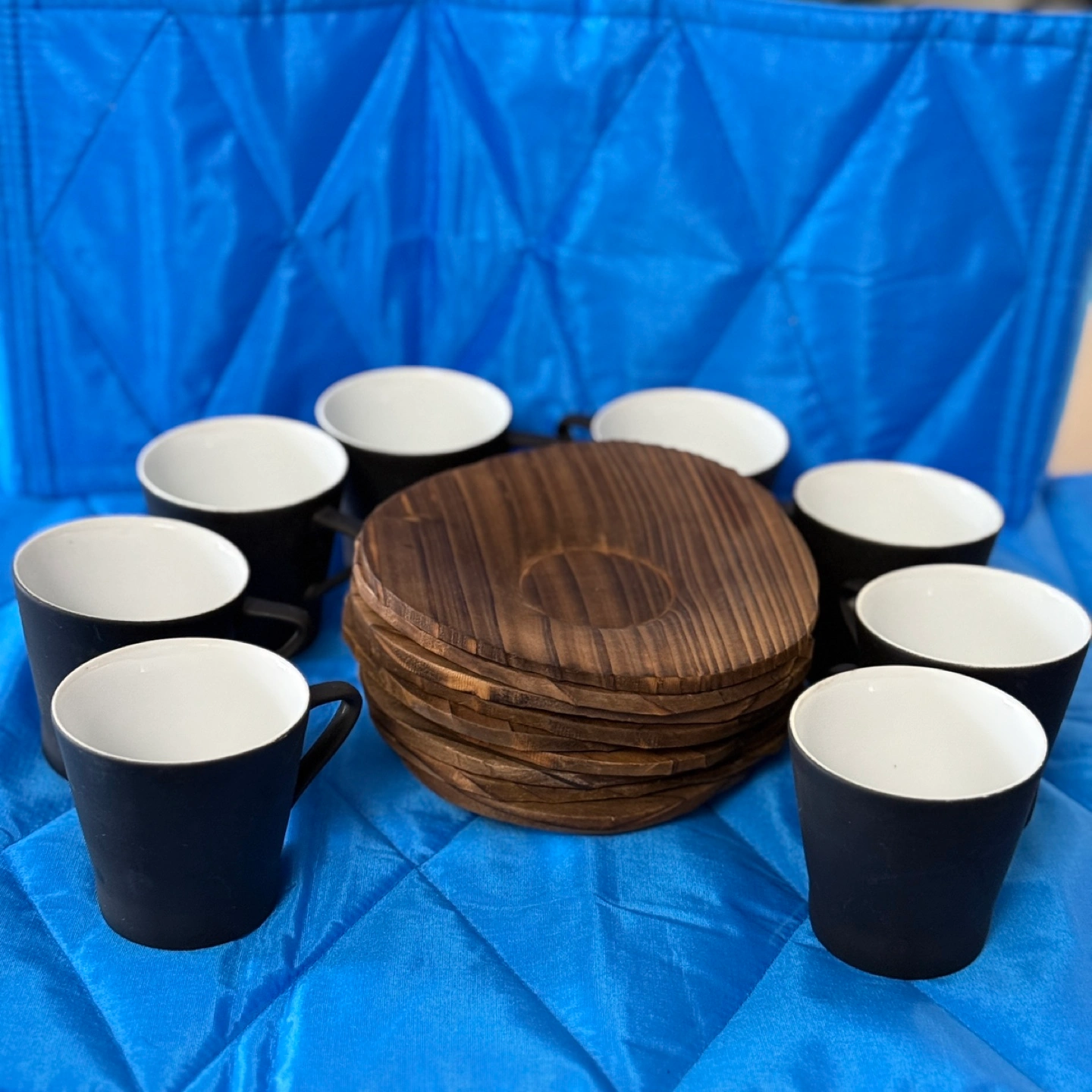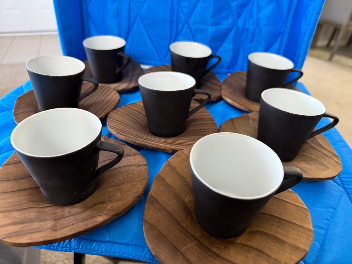 Eight black espresso cups with white interior. Small, sleek design. Includes eight matching dark brown wooden coasters. Perfect for espresso, coffee, or tea. Vintage Kenji Fujita Black Porcelain 8 Cups and Wood Saucers