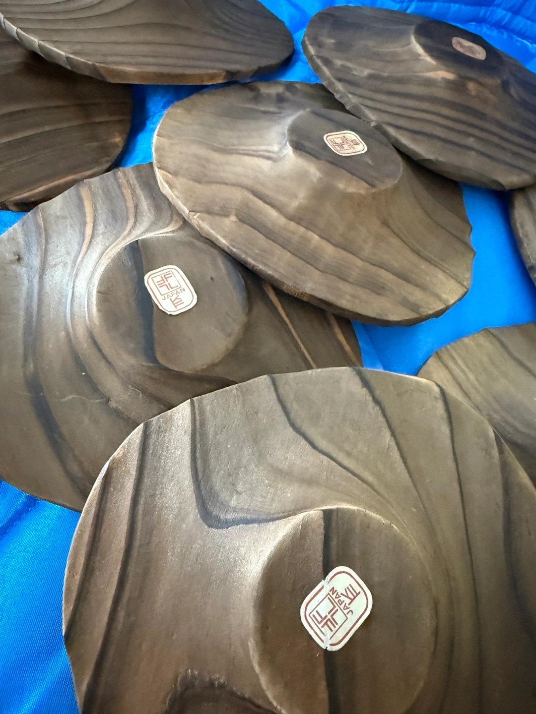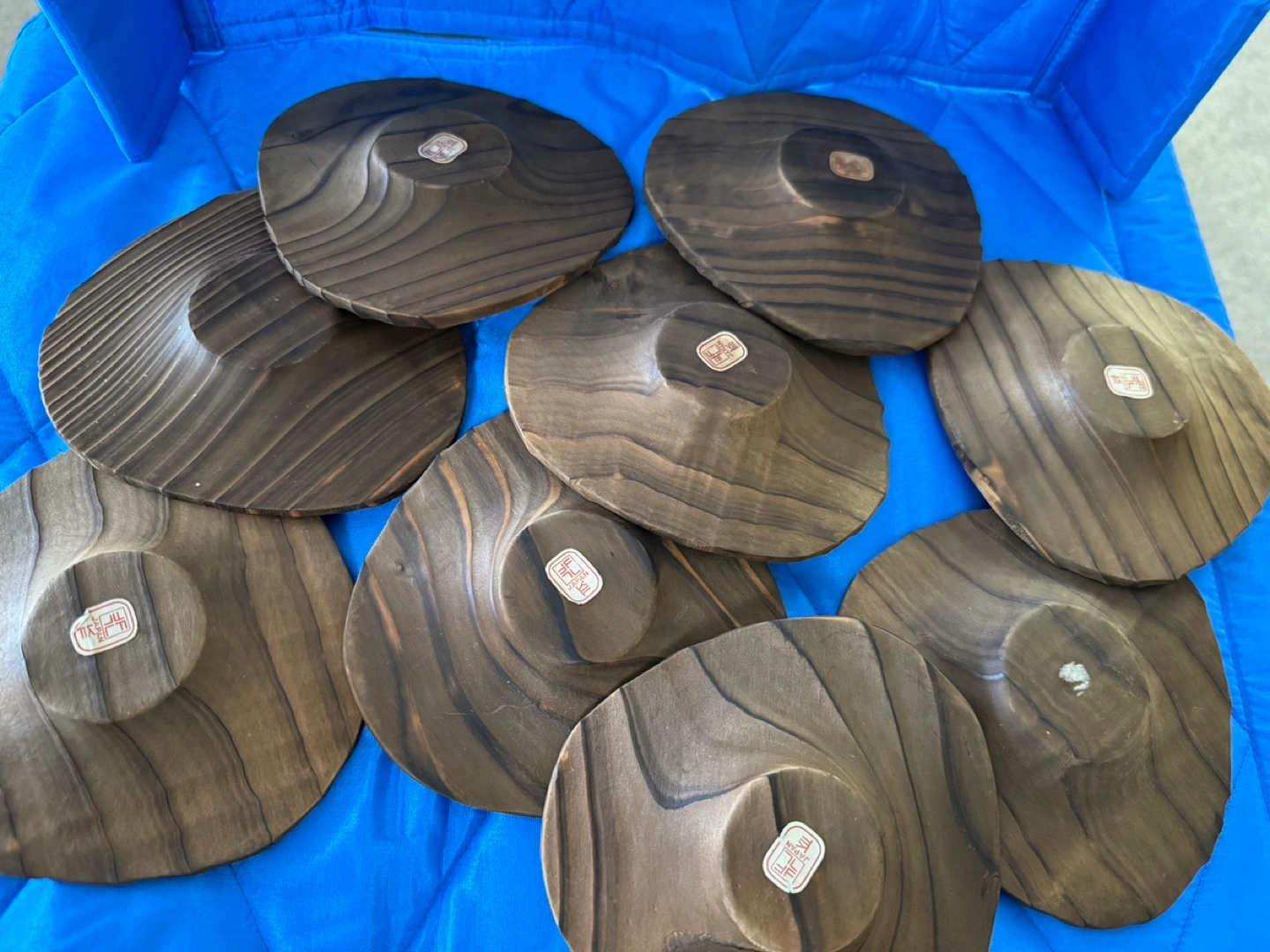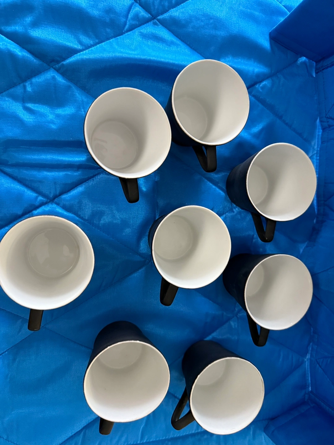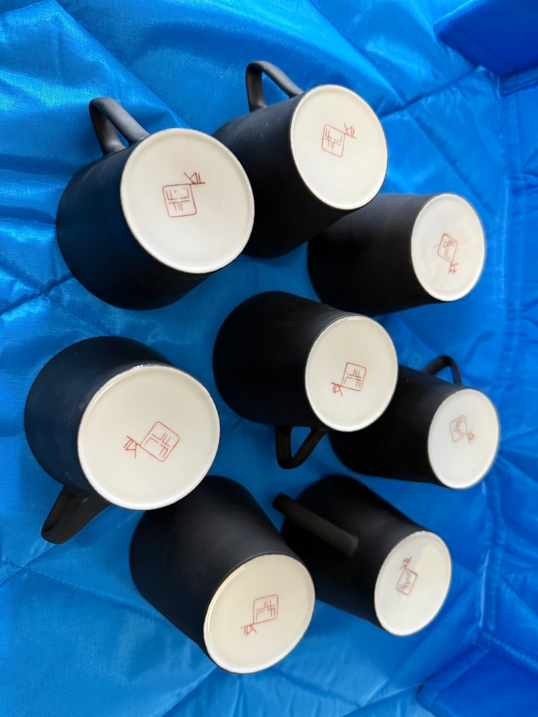Eight black espresso cups with white interior. Small, sleek design. Includes eight matching dark brown wooden coasters. Perfect for espresso, coffee, or tea. Vintage Kenji Fujita Black Porcelain 8 Cups and Wood Saucers