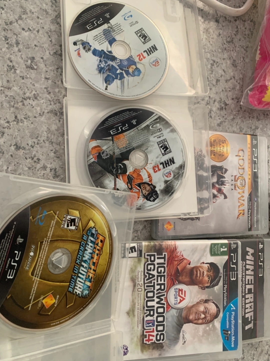 Lot of PlayStation 3 games. Includes NHL 12, NHL 13, Ratchet & Clank: A Crack in Time, Tiger Woods PGA Tour 14, and Minecraft PlayStation 3 Edition. Pre-owned.