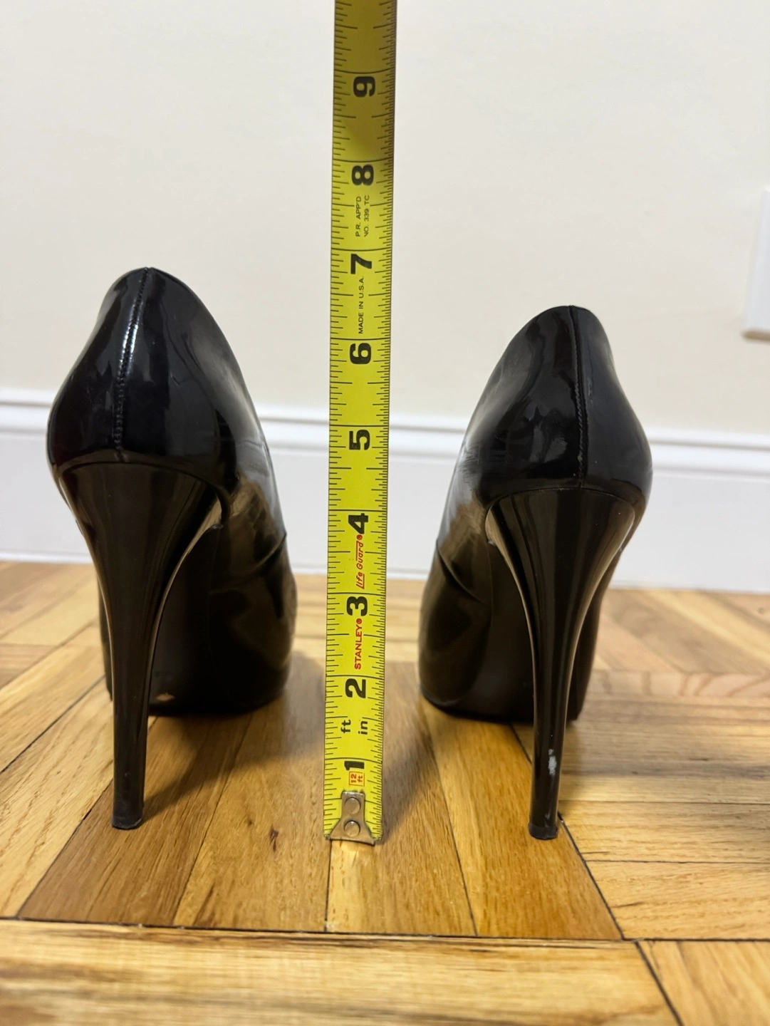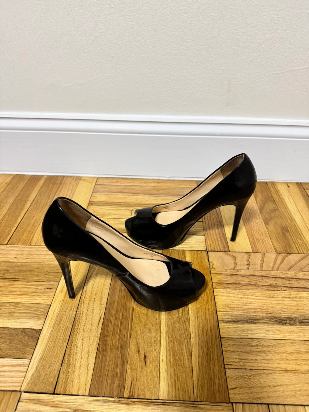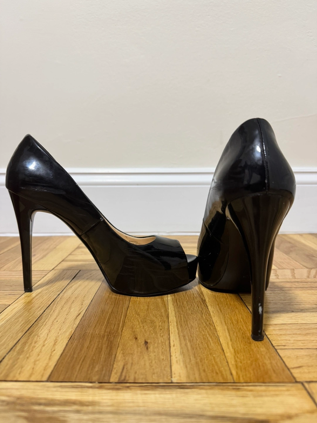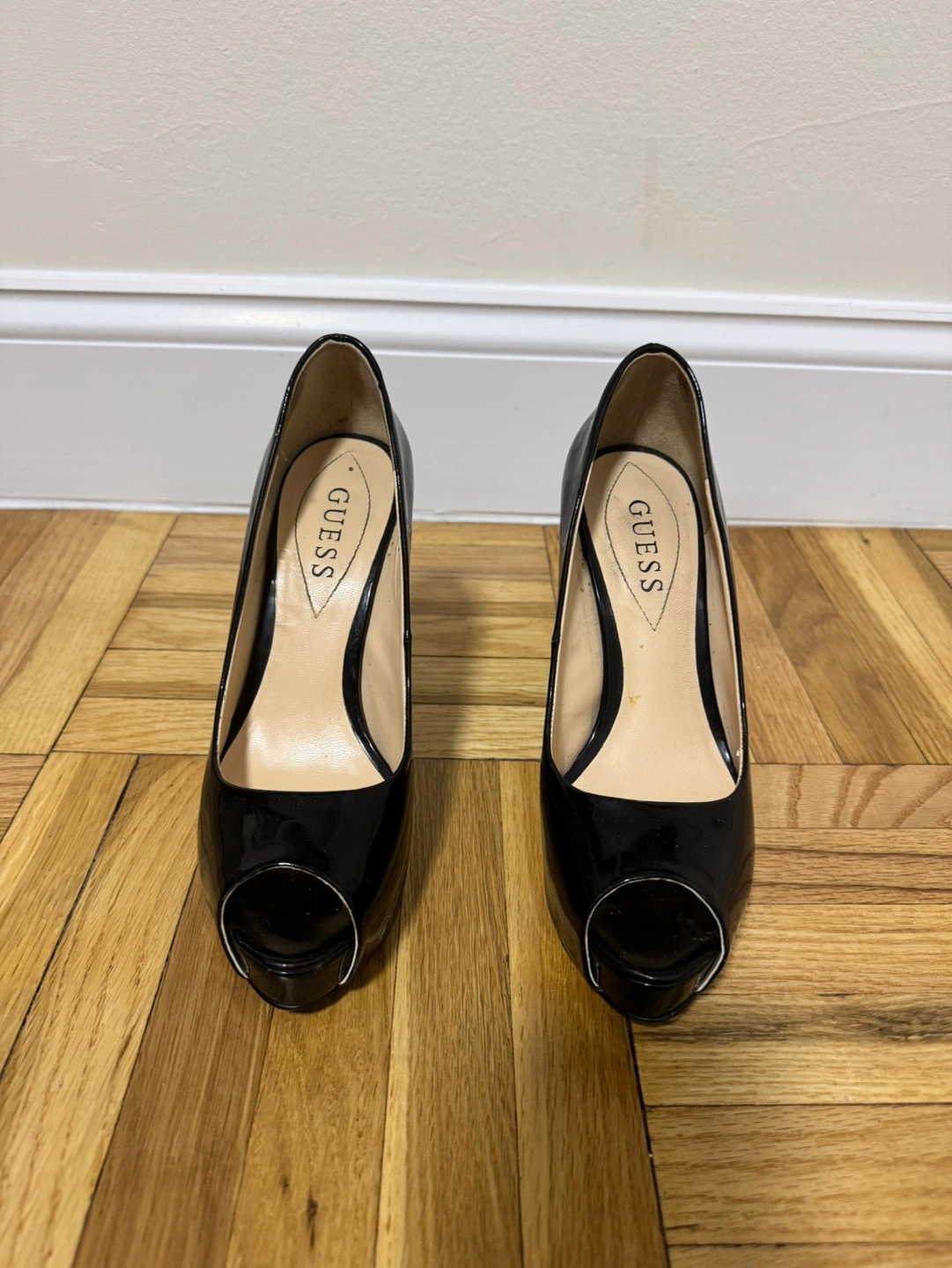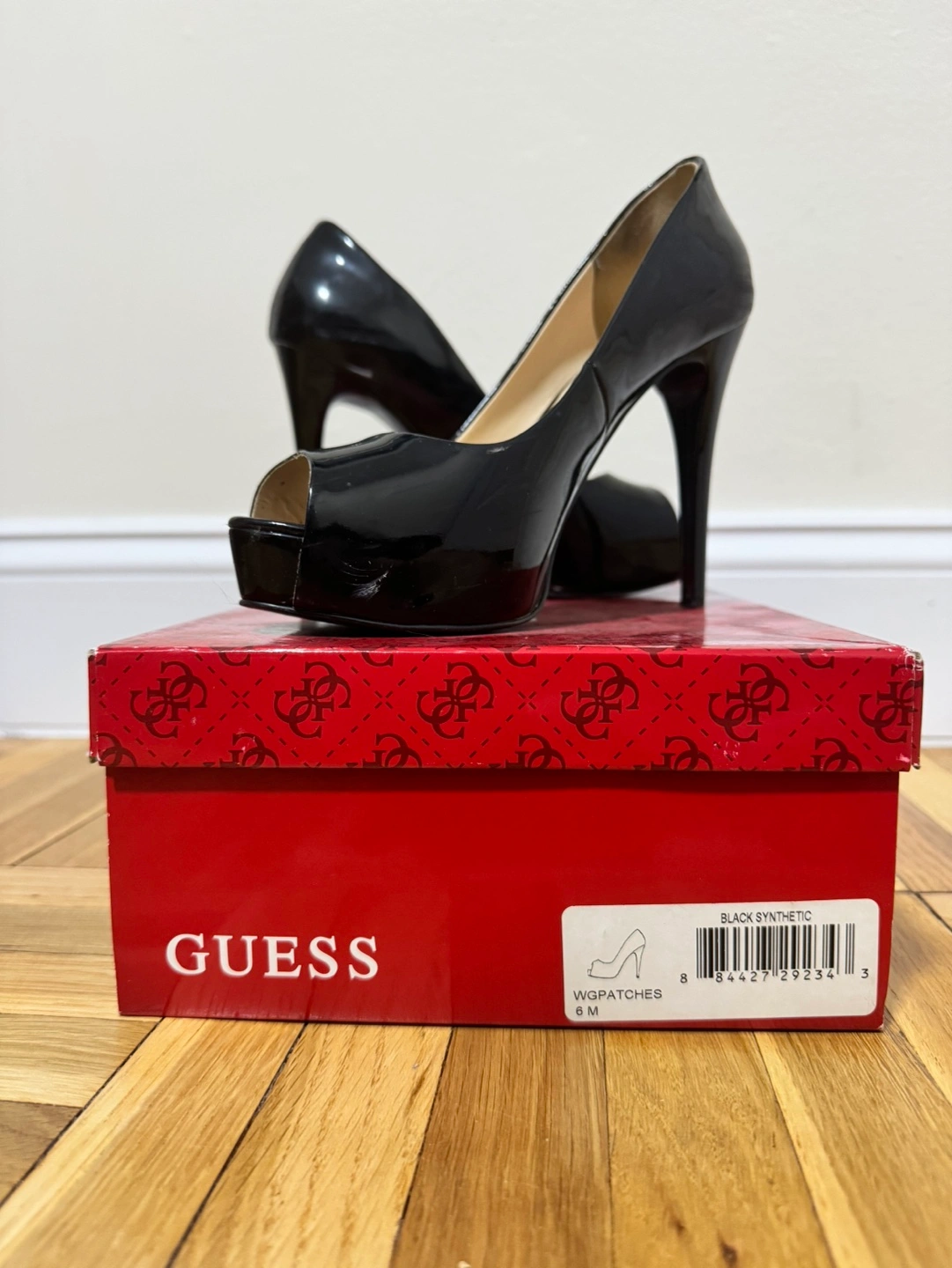 Pre-owned GUESS Women's black patent leather WGPATCHES peep-toe heels. Good condition. Comes in original box. No longer sold, but original retail price of $100. Size: 6M Heels: 4.5 inches Pickup is on 72nd and 1st in Manhattan. Preference given to whoever schedules pickup first.