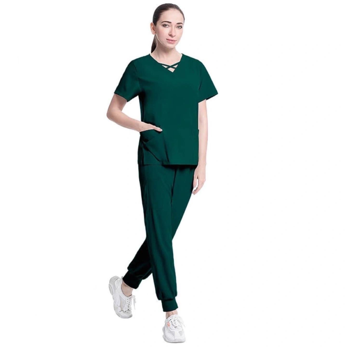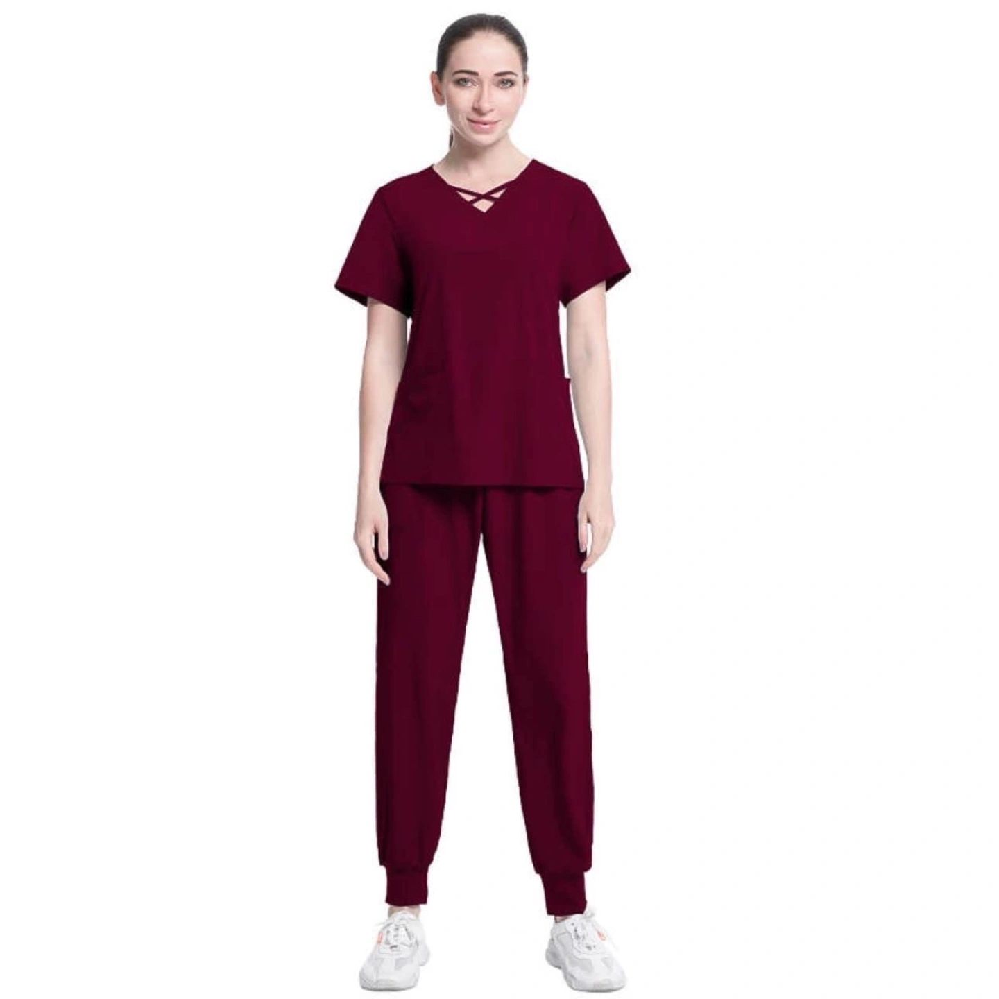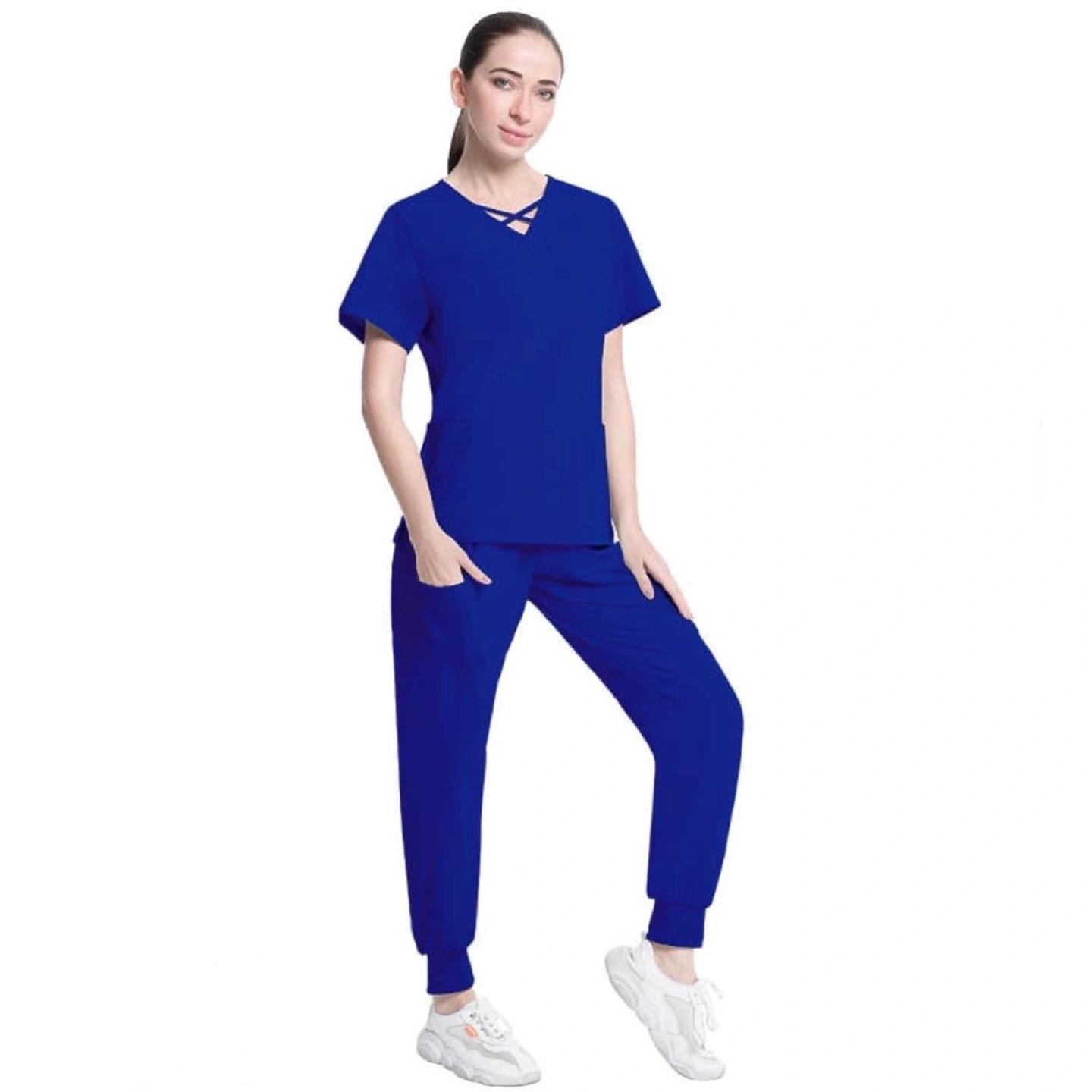 Comfortable two-piece scrub set. Features a V-neck top with criss-cross detail and jogger-style pants. Multiple colours available. Perfect for medical professionals or students.