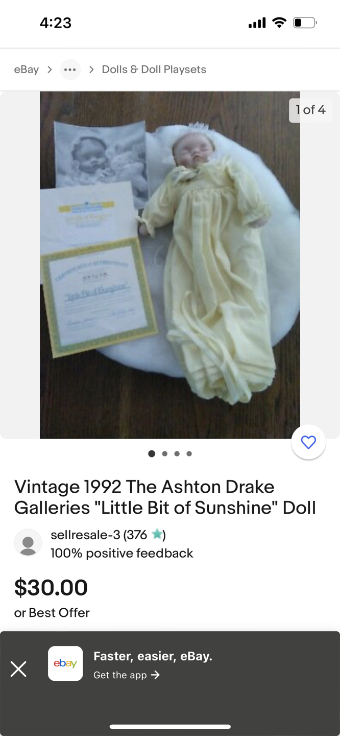 1 / 41 / 4Buy & SellCollectors dollCollectors doll$15Vintage Ashton Drake Gaby Rademann Little Bit Of Sunshine Porcelain DollWHERE TO MEETHuron HeightsView MapSELLERDJArgyle14836 reviews0 chats·0 favorites·19 viewsSEND CHAT TO SELLERHi DJ! I’m interested in your listing.Hi DJ! I’m interested in your listing.Get the Karrot app to chatSign In to chat