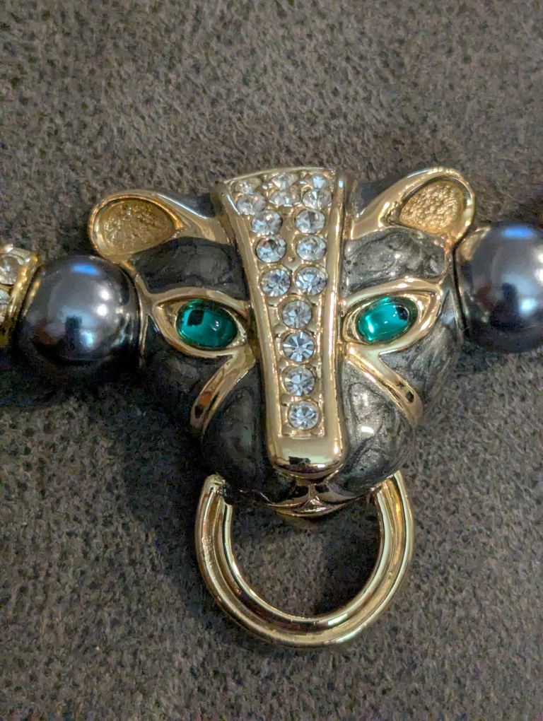 Beautiful dark grey pearl necklace. Features a striking panther head pendant with rhinestones and green eyes. Gold-toned clasp and accents. Elegant and eye-catching.