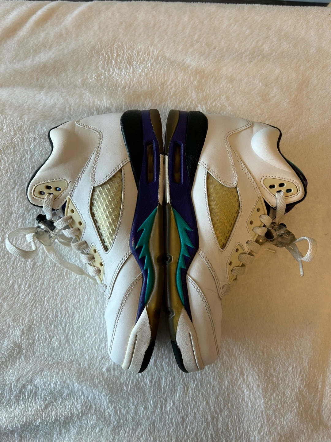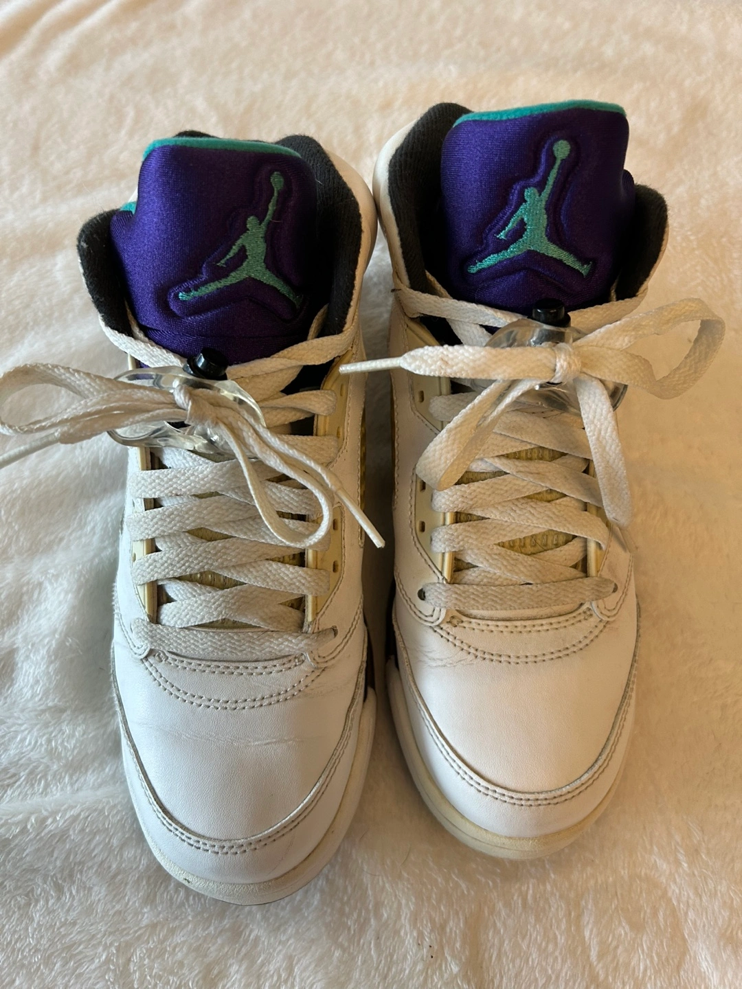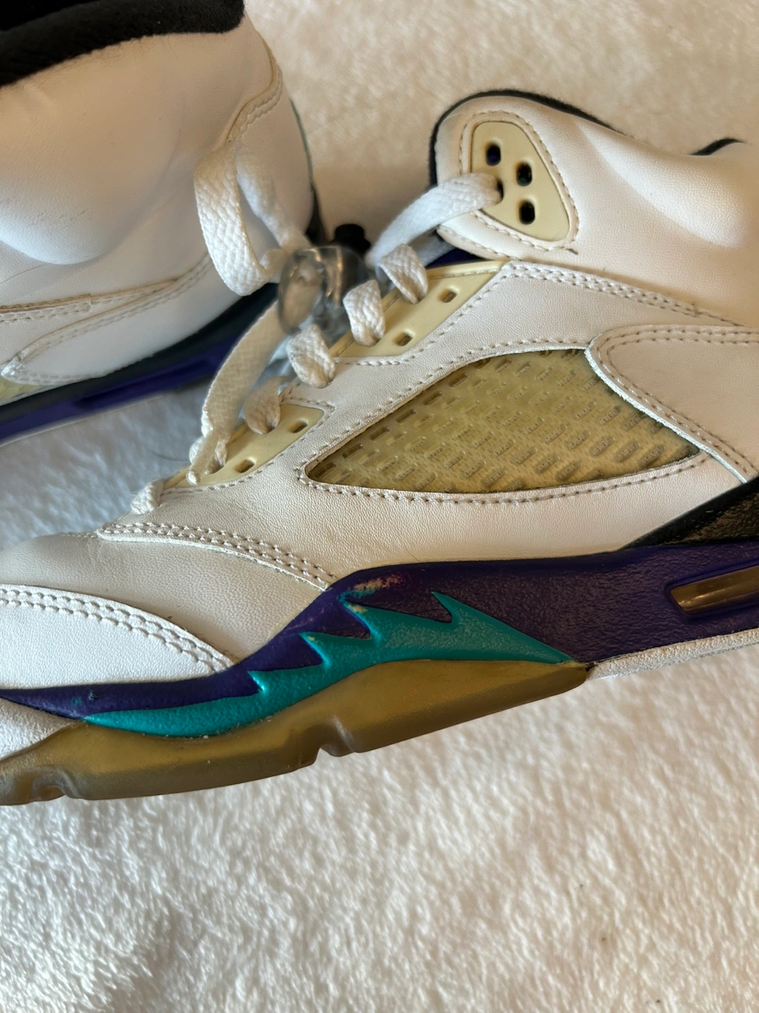 Air Jordan 5 Retro sneakers. White leather upper, purple and teal accents. Pre-owned condition.