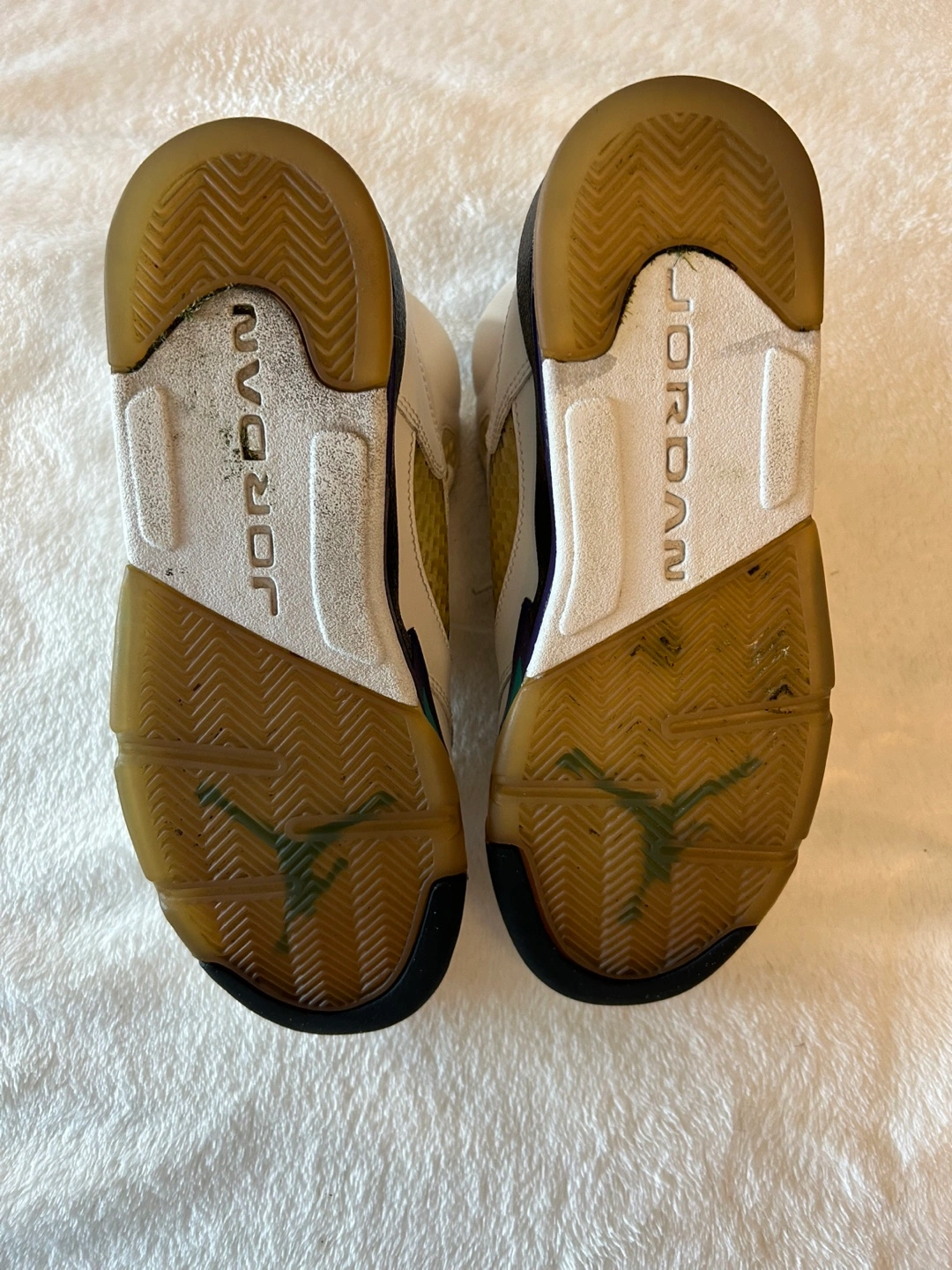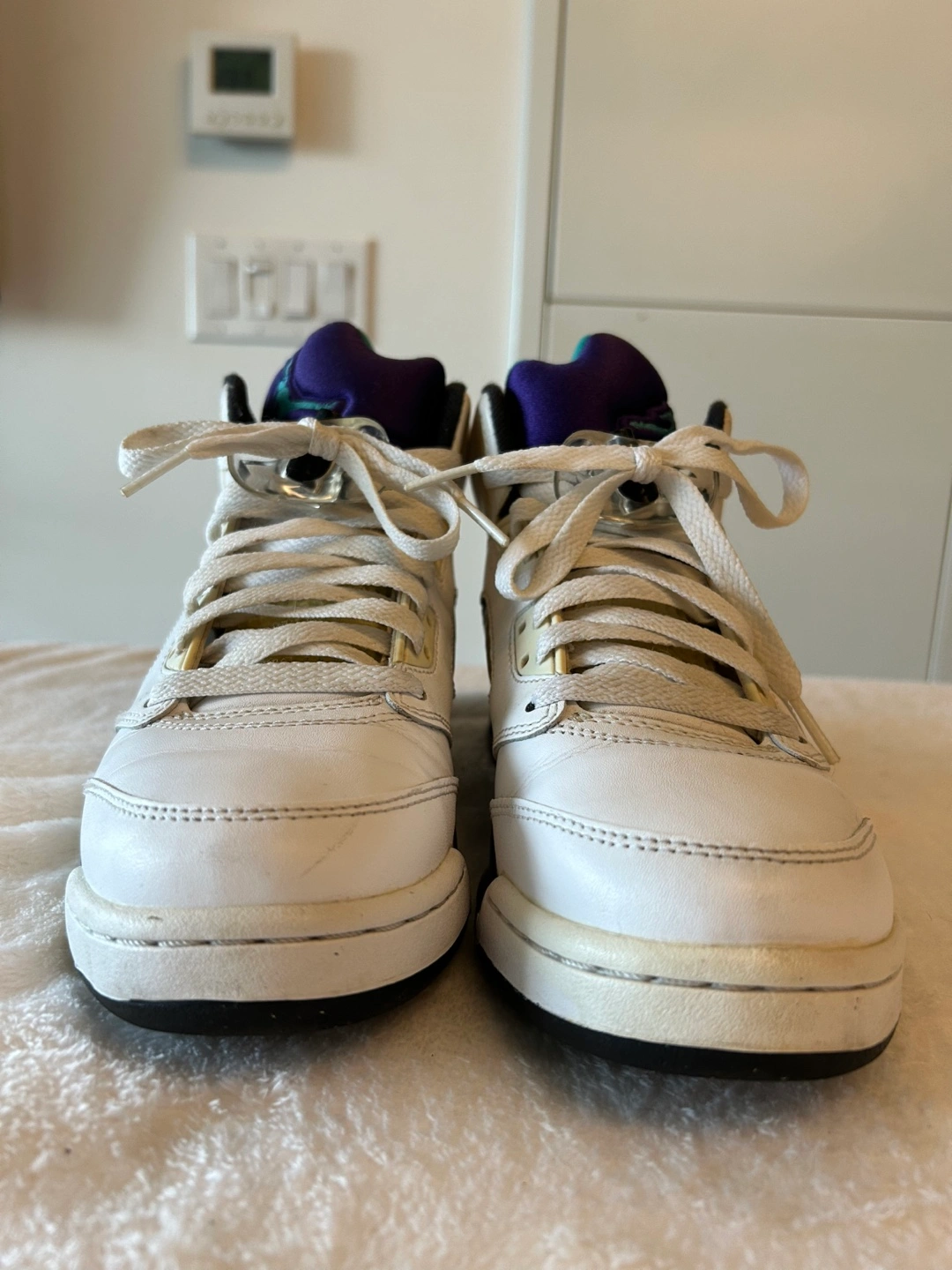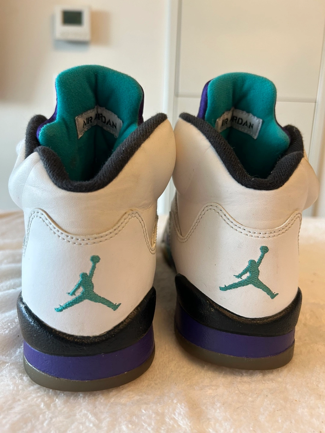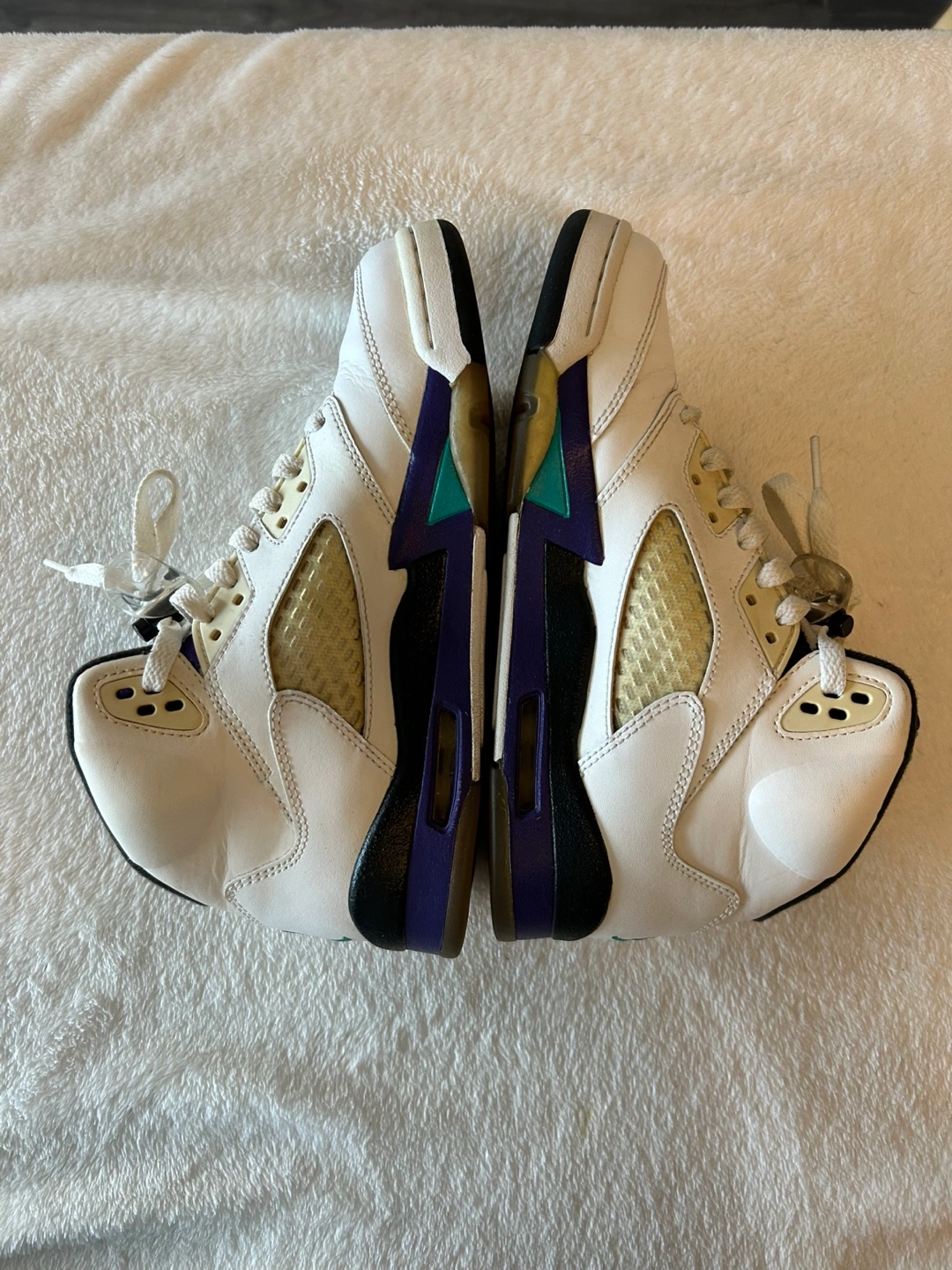 Air Jordan 5 Retro sneakers. White leather upper, purple and teal accents. Pre-owned condition.