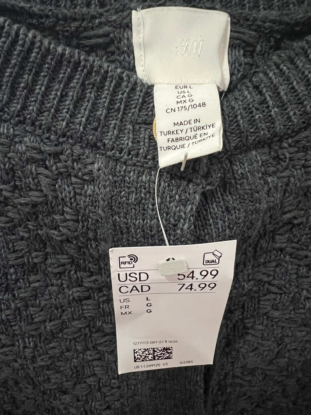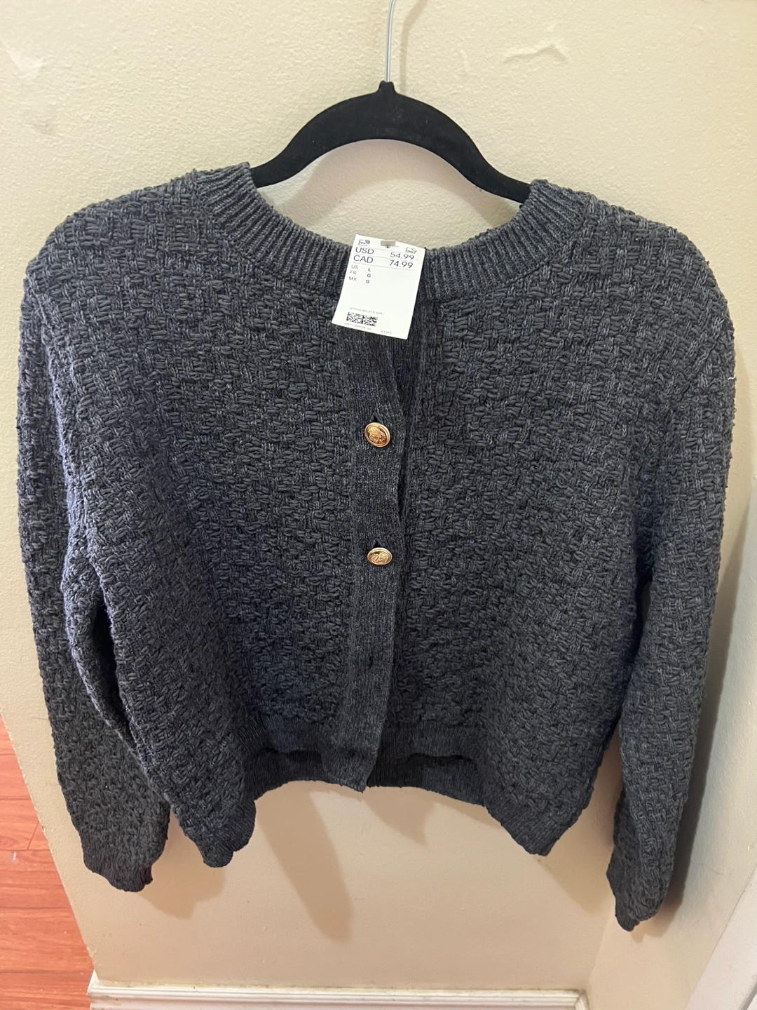 Purchased in February 2025 from H&M USA Original Price: $54.99 USD / $74.99 CAD Selling a brand new H&M knit cardigan, never worn, with tags still attached. Size L (Large). Color: Dark gray Material: Textured knit fabric • Style: Button-up front with gold-tone buttons