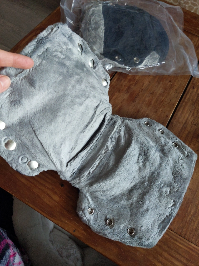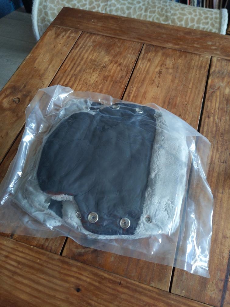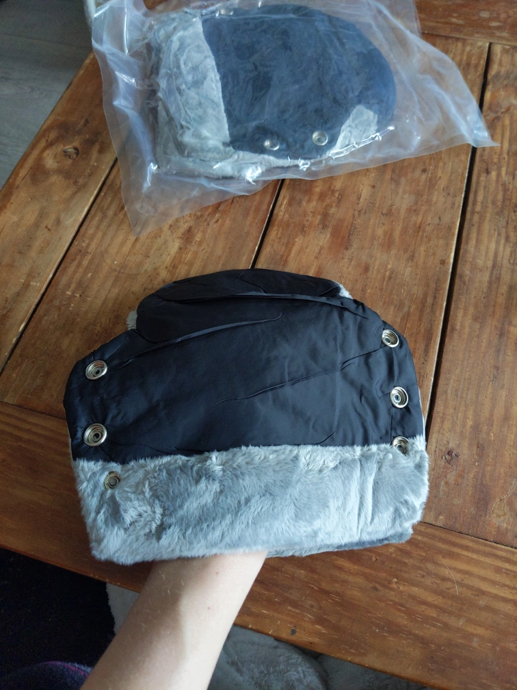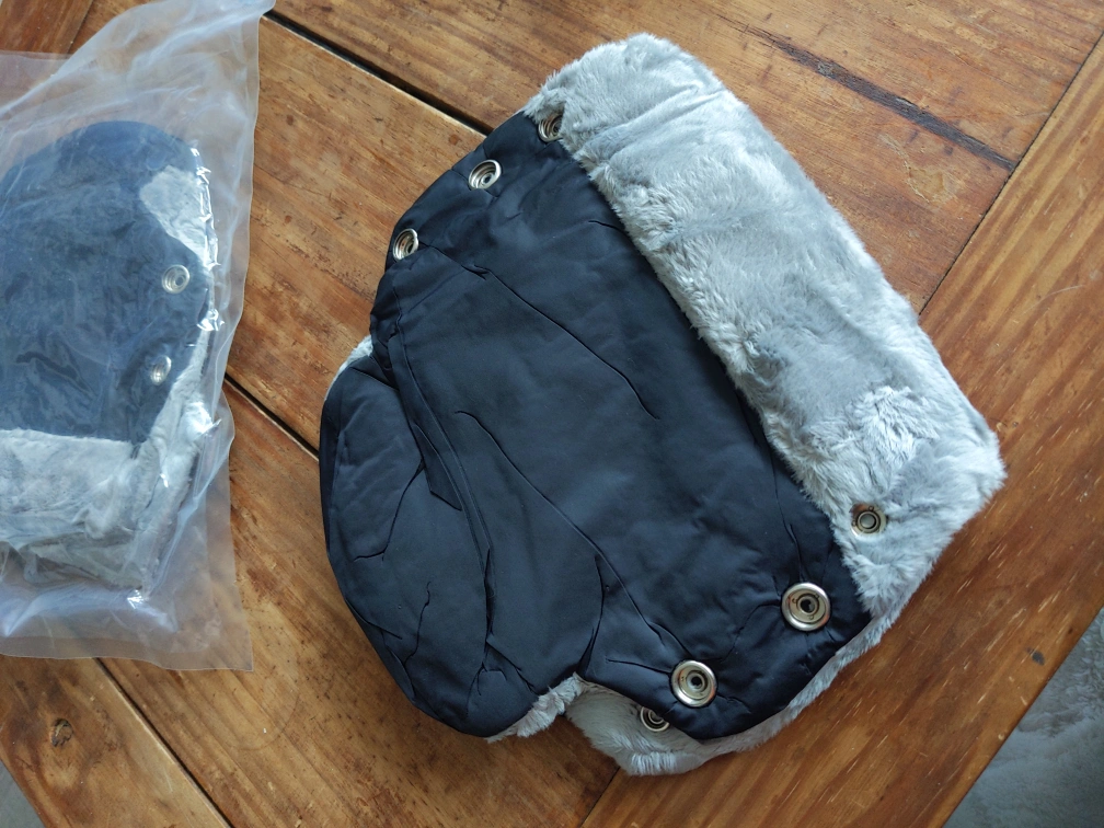 Pair of grey stroller hand muffs. Soft faux fur exterior, black nylon interior. Snap closures. Keeps hands warm in cold weather.