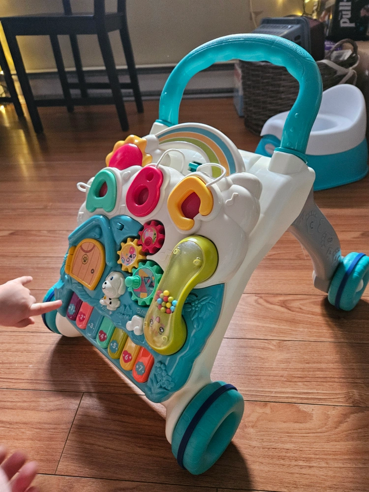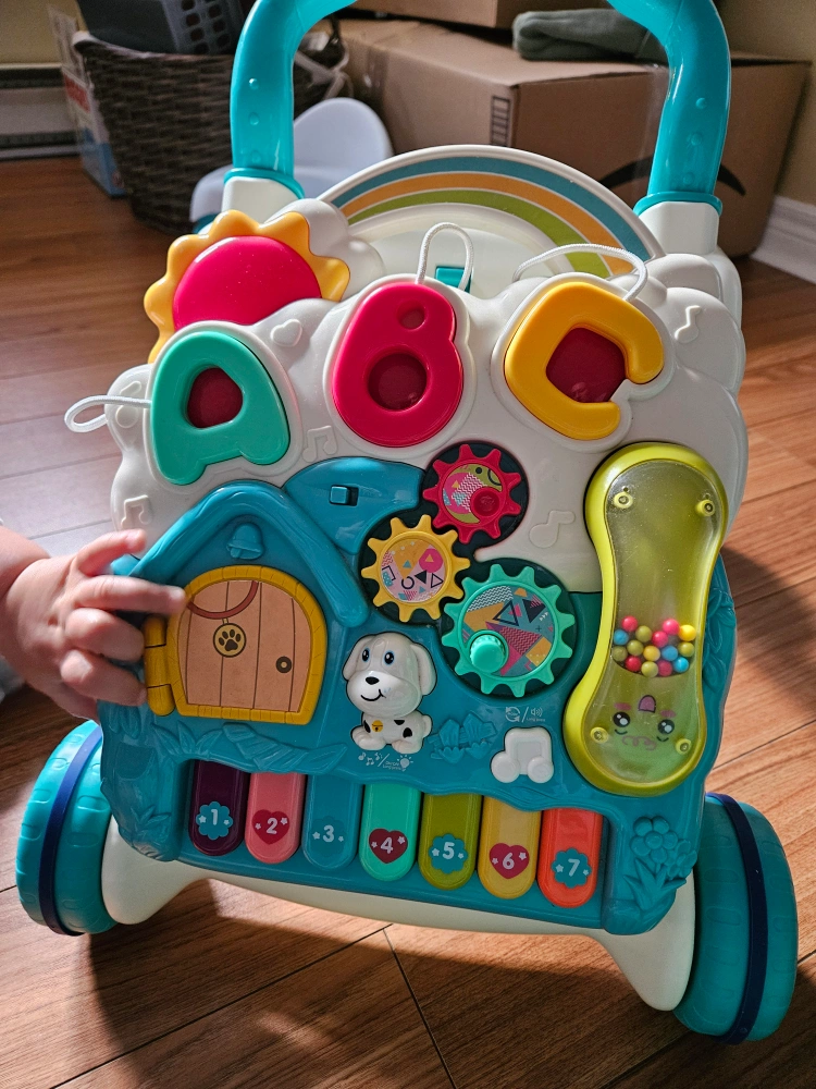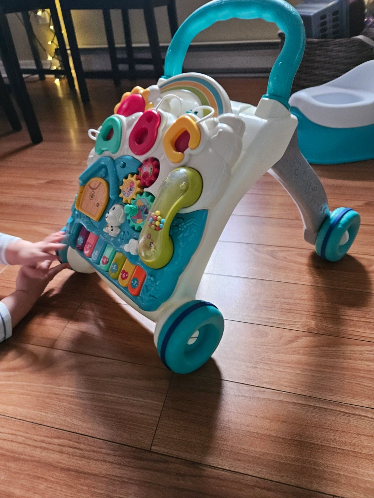 Adorable baby walker, features activity panel with lights and sounds. Multiple textures and activities. Great for encouraging early development. Teal and white colour scheme.