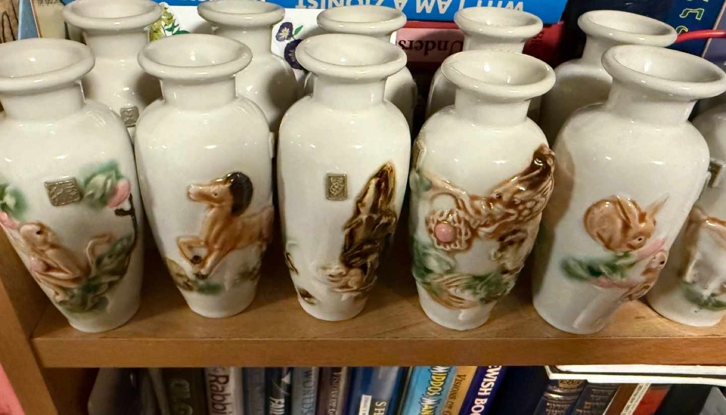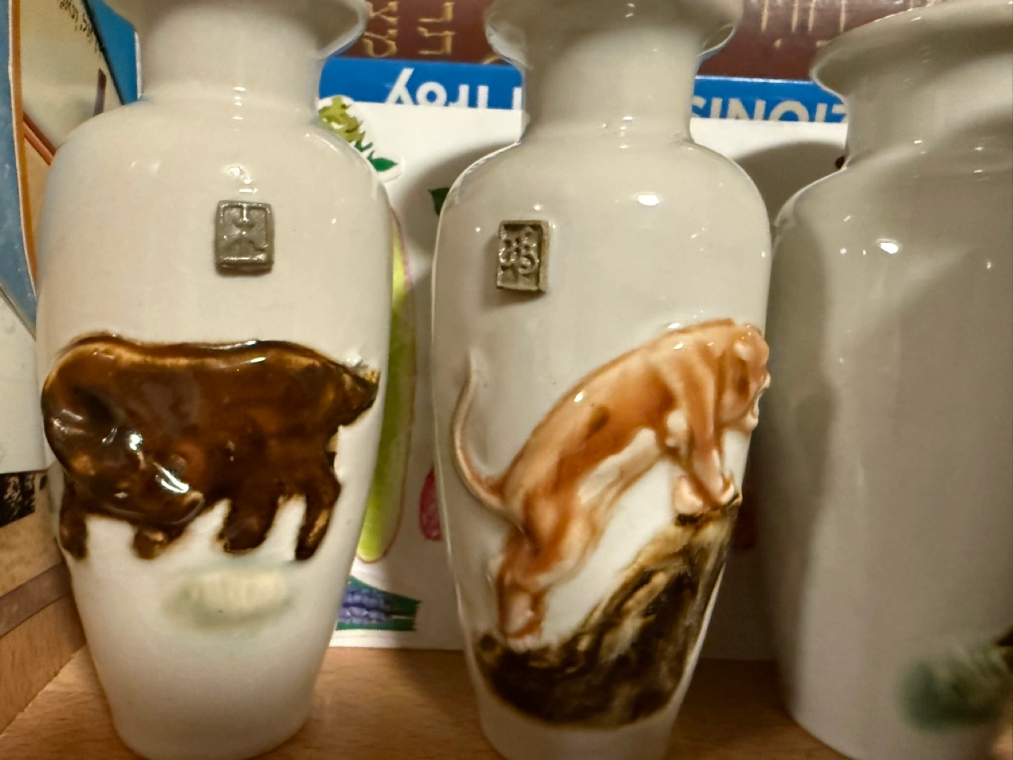 Collection of twelve small ceramic vases. Each vase features a different animal of the Chinese zodiac. Adorable and unique. Perfect for display or small flowers.