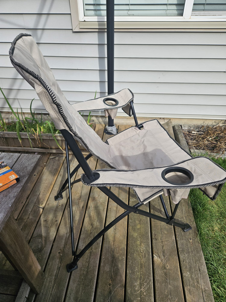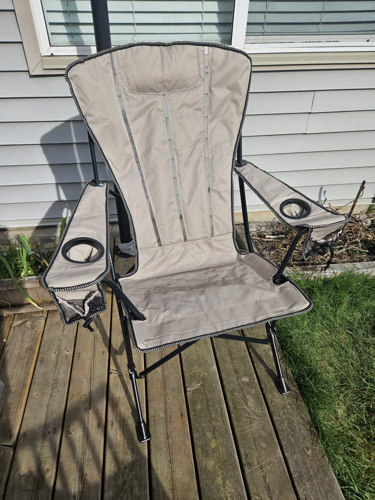 Comfortable, foldable and portable camping chairs Include carrying case. Cup holders on both armrests.