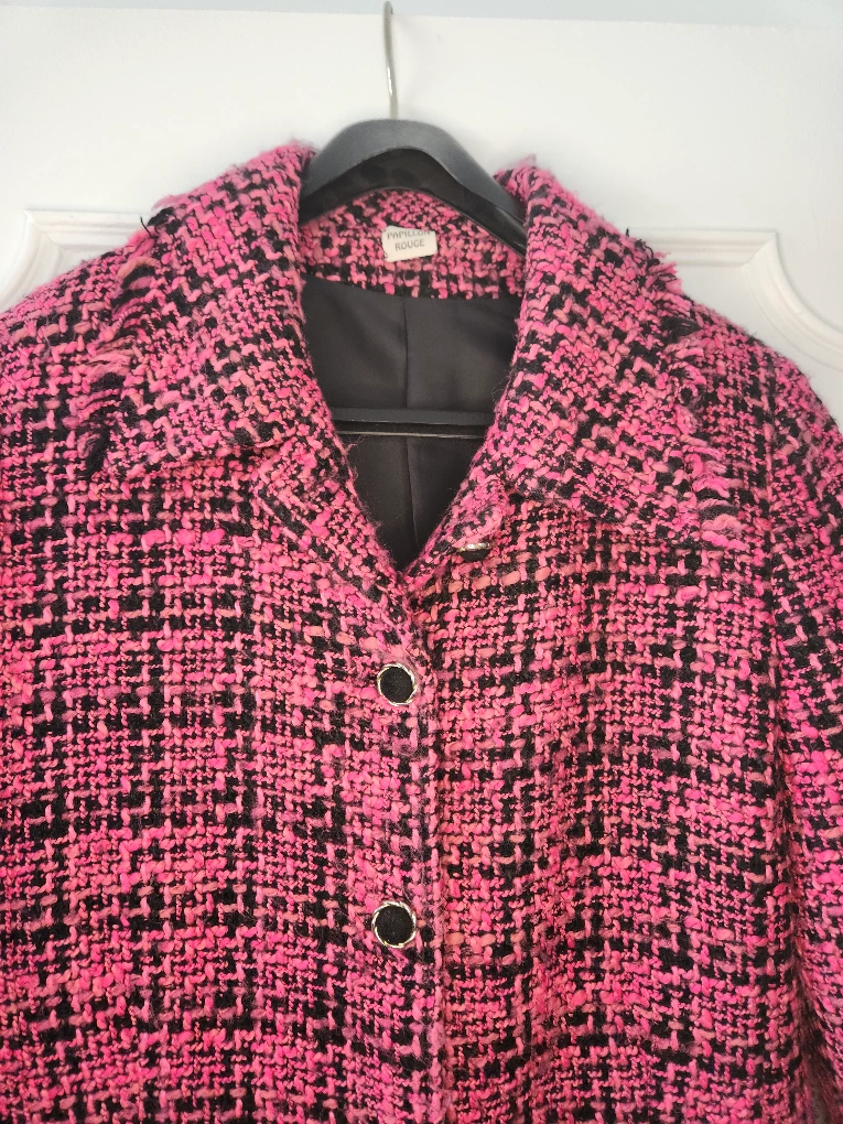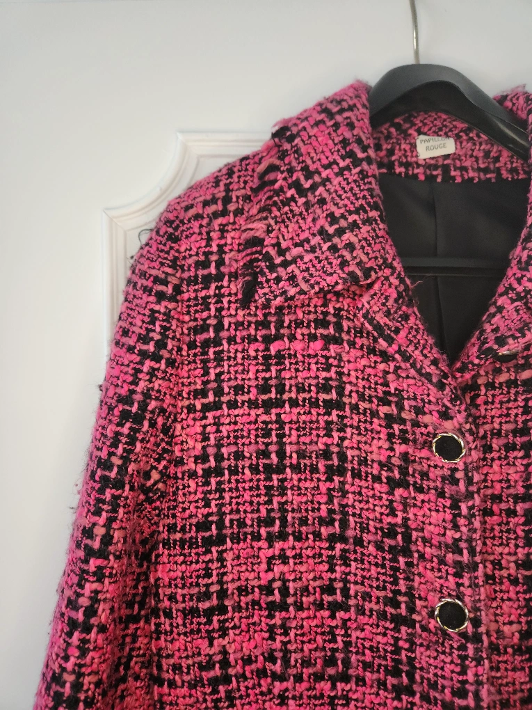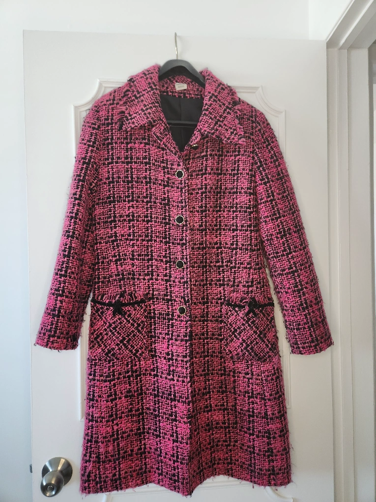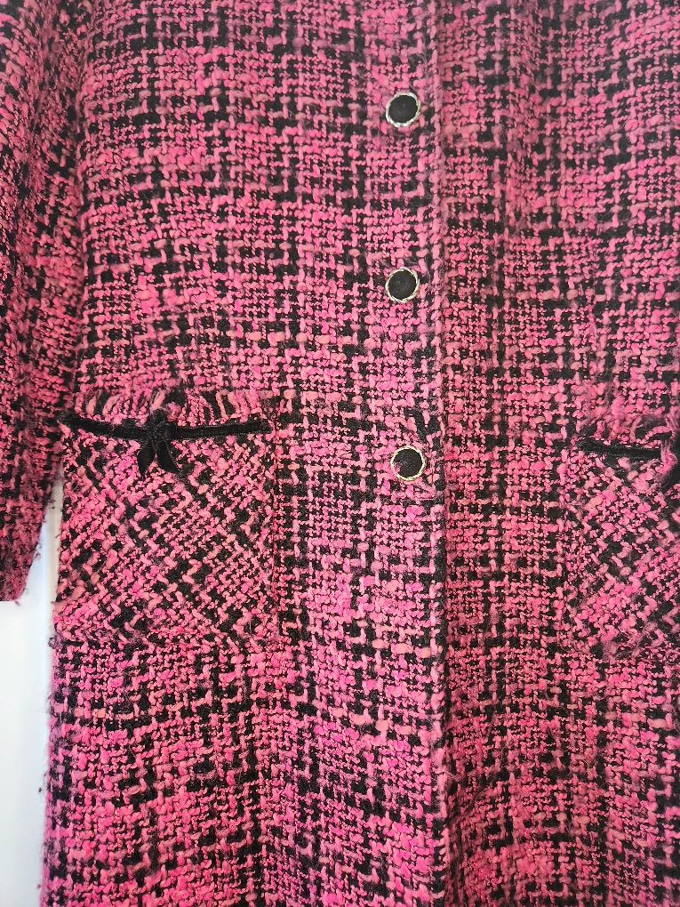 Women's long-sleeved coat. Pink and black tweed pattern. Button closure. Two pockets with bows. Collared.