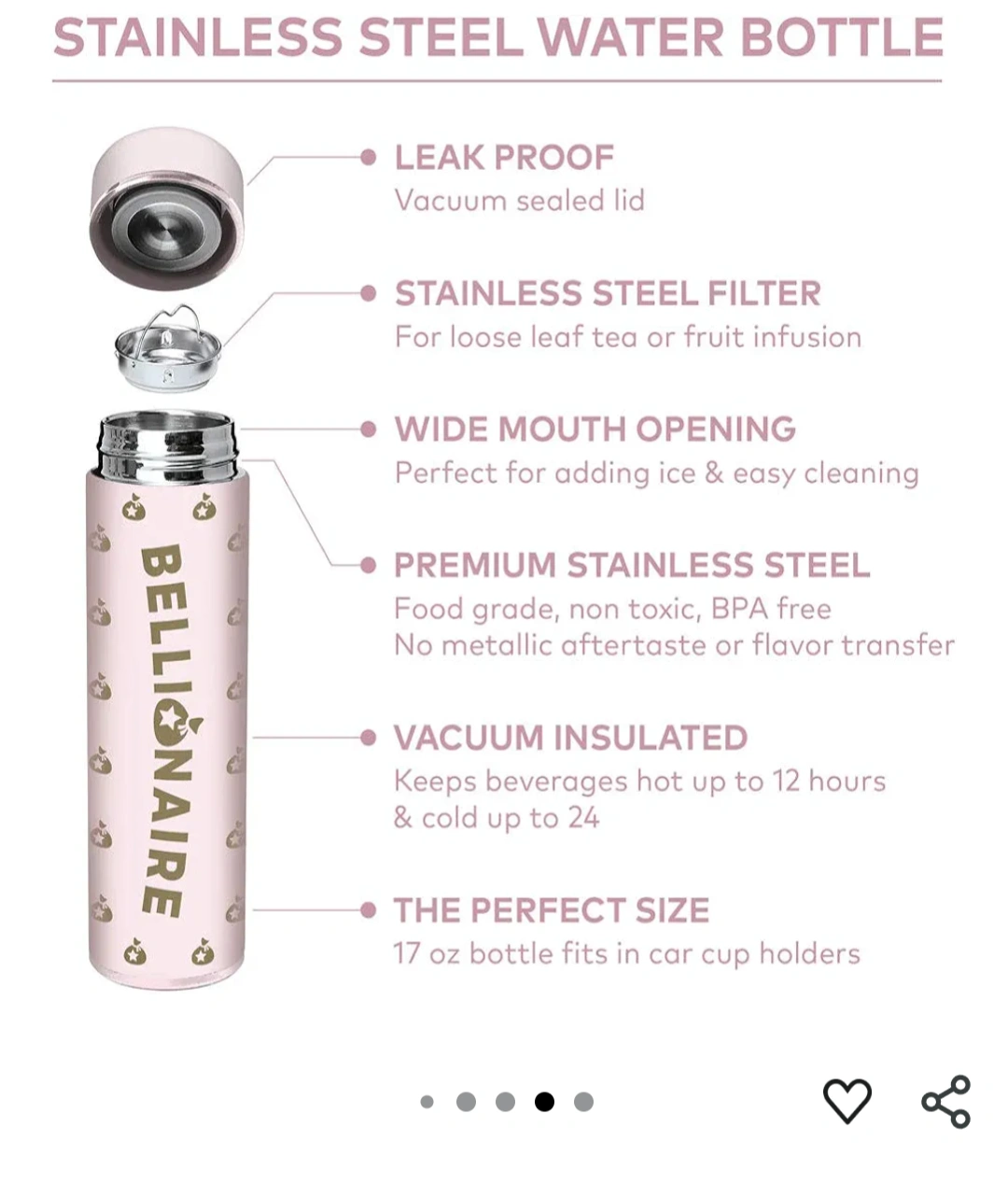 Vacuum insulated. Keeps beverages hot up to 12 hours and cold up to 24. Leak proof vacuum sealed lid. Wide mouth opening. Premium stainless steel, BPA free. Includes stainless steel filter for loose leaf tea or fruit infusion. Fits in car cup holders.