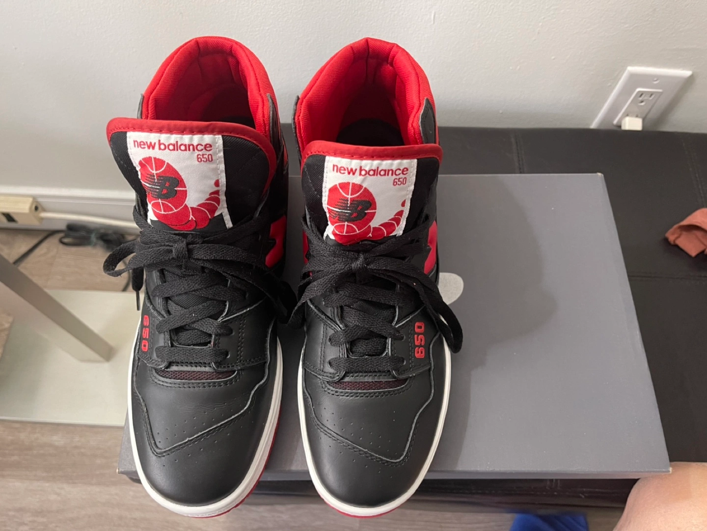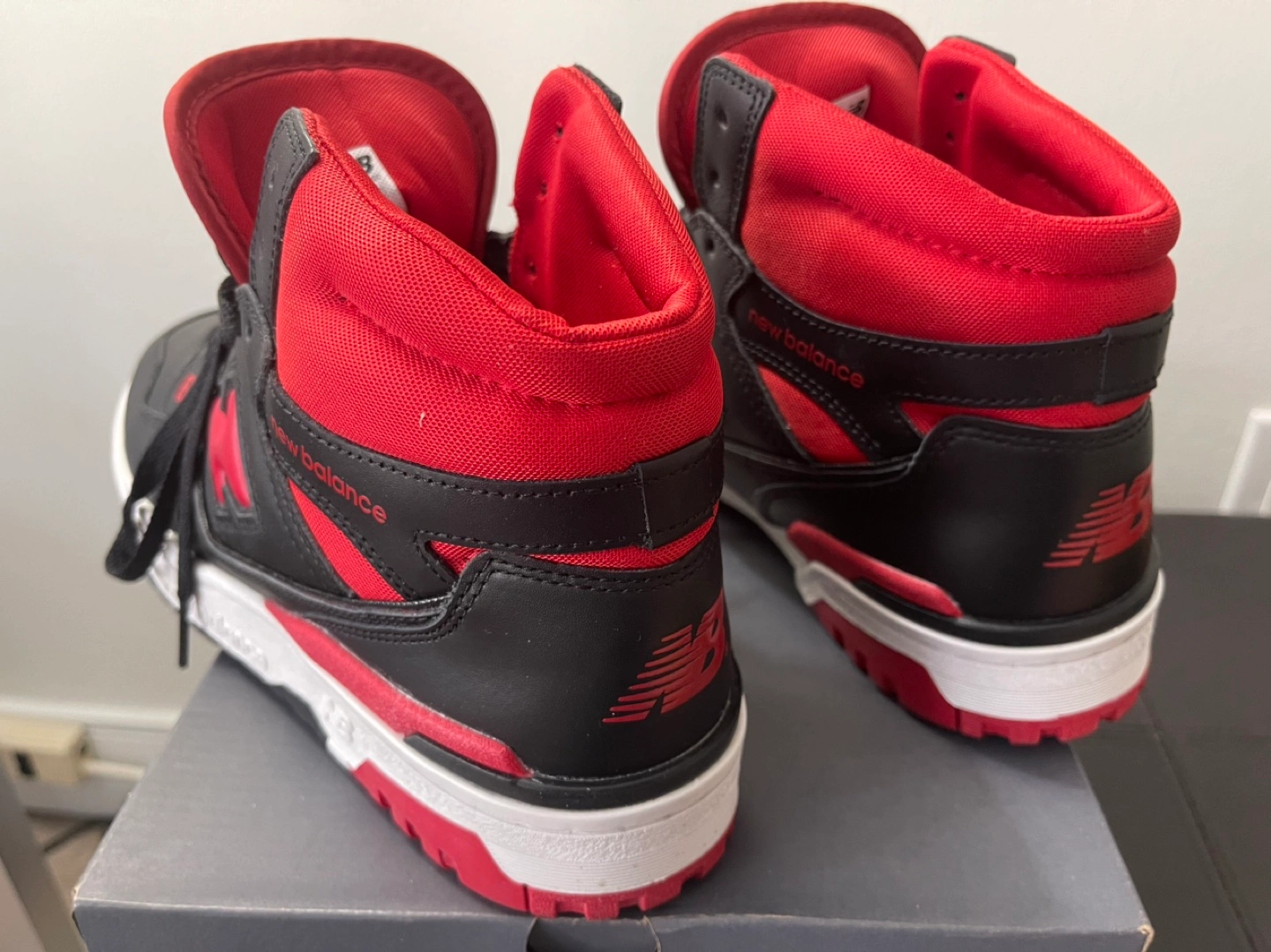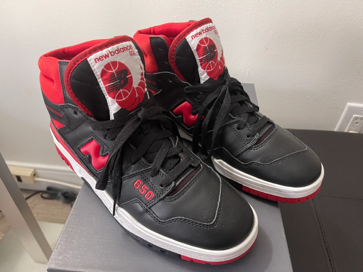 New Balance 650R basketball shoes. Men's size 11. Black and red colourway. High-top design. Pre-owned, in box.