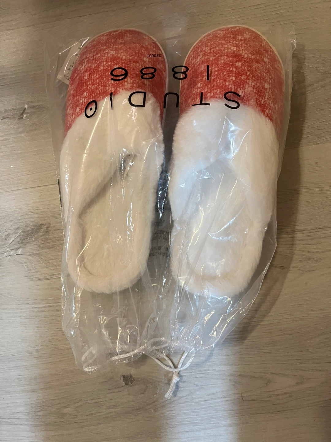 Cozy slippers, red and white pattern. Fluffy white lining. Size 7-8. New with tags.