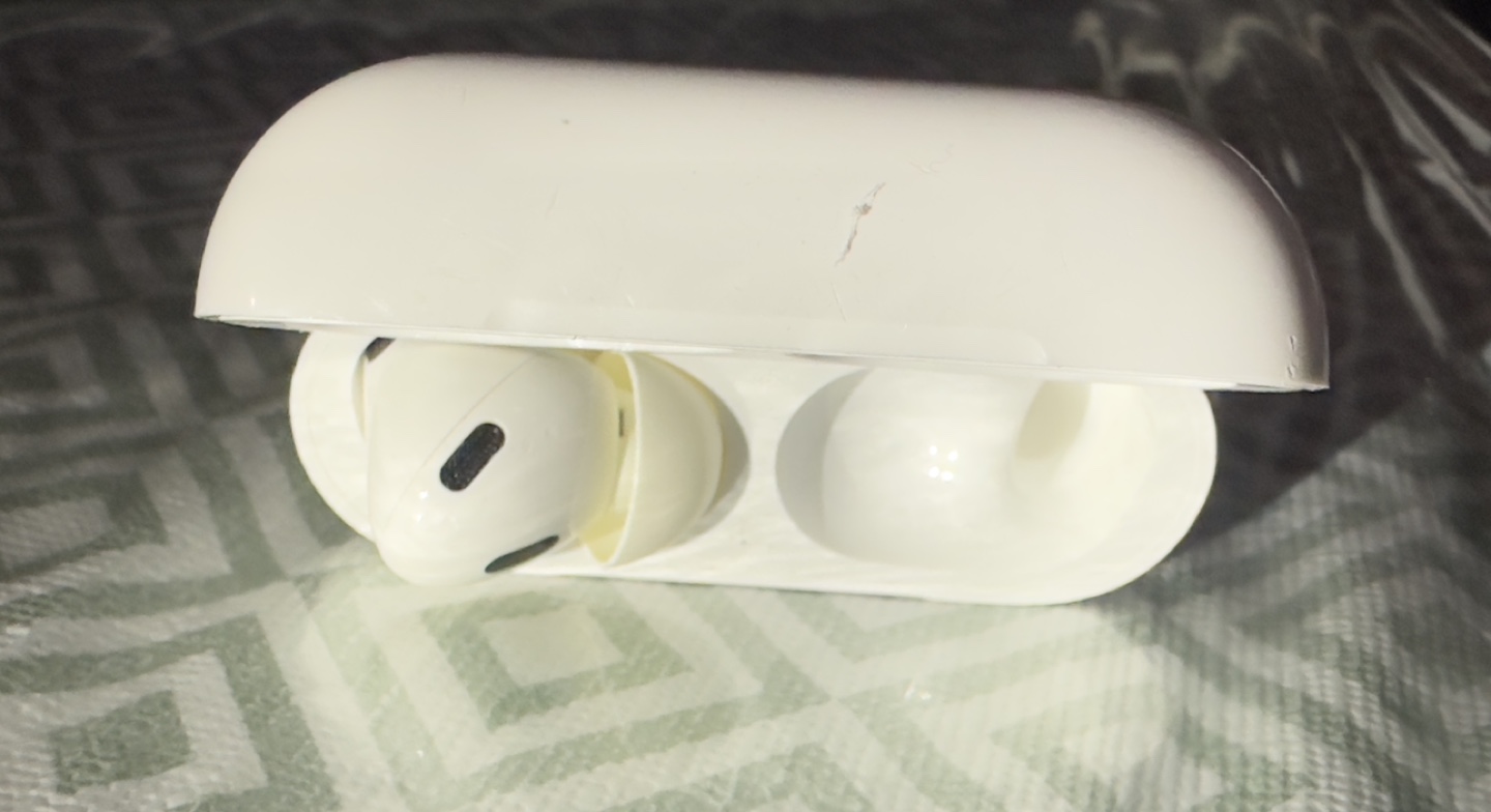 Used Apple AirPod Pro2 gen with usb-C port. Right bud is missing working great.Earbuds and case are white. Includes a beige silicone case.