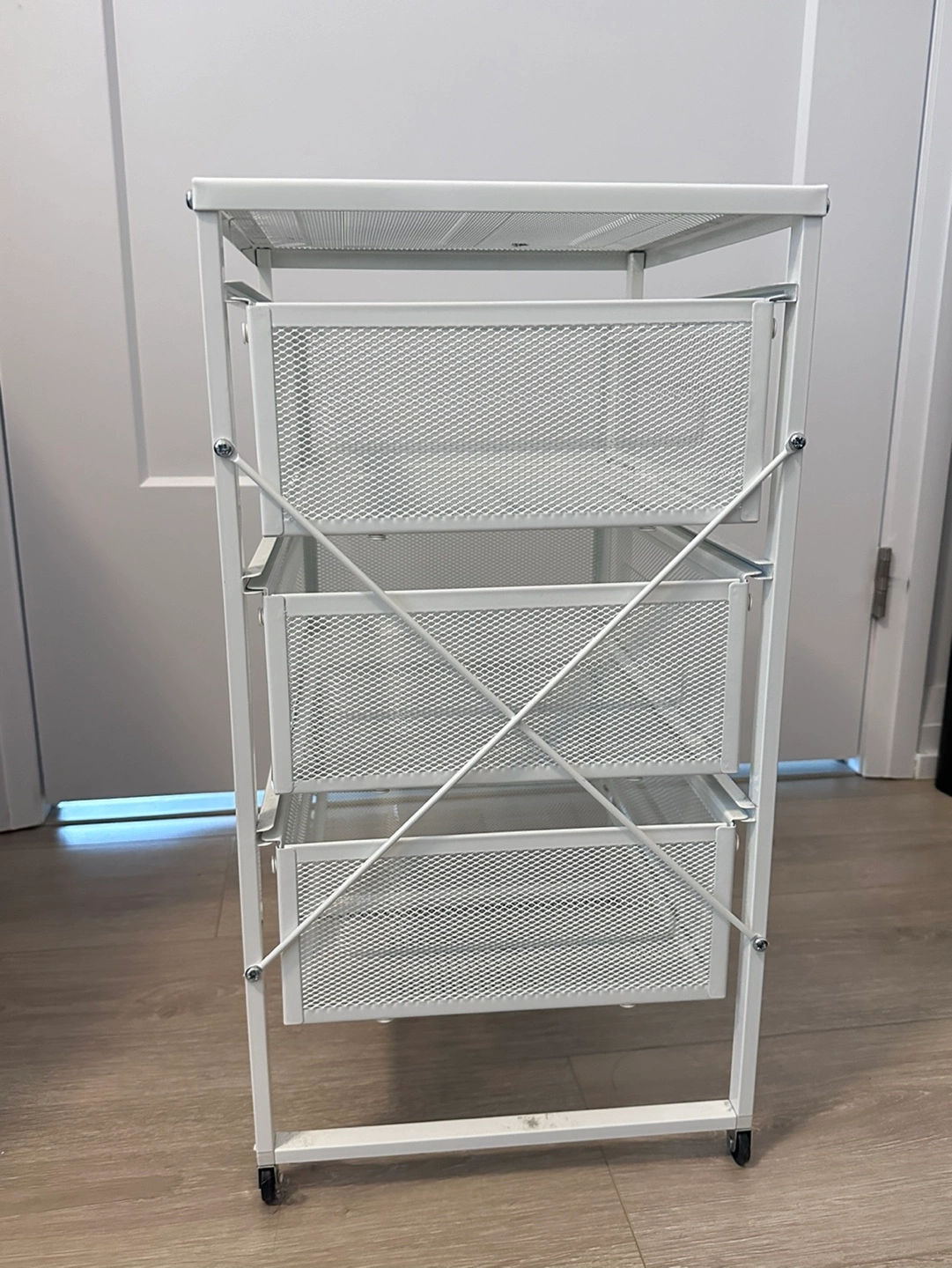 Three-drawer rolling cart. Wheels only on the back. Metal frame and mesh drawers. Great for organizing small items. Minor small spot on the top