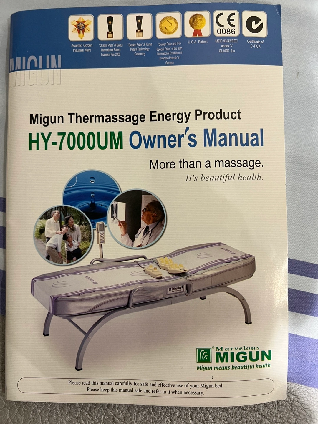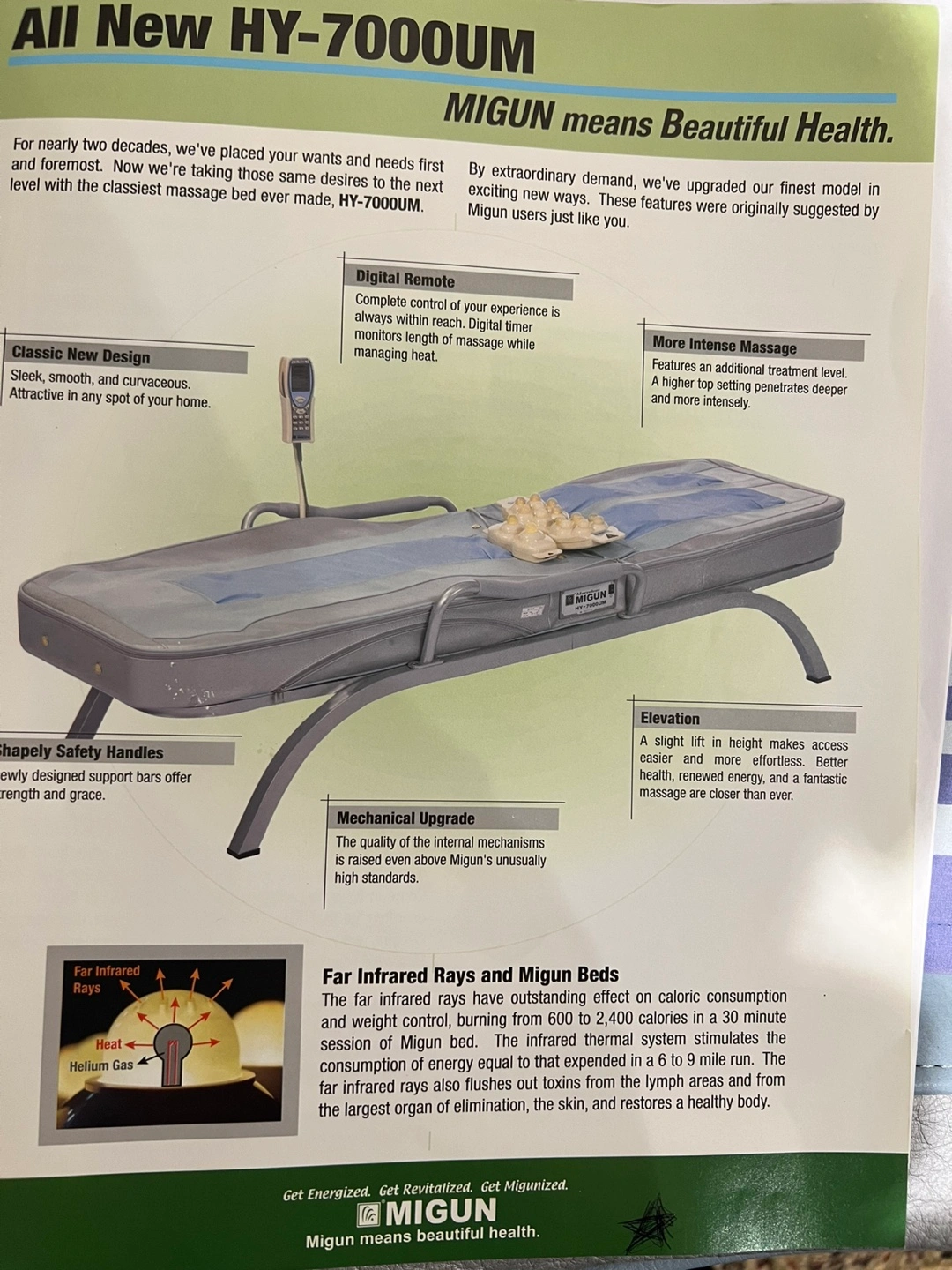 This New NY- 7000 UM Migan thermassage energy product more than a massage, it’s beautiful health with far infrared rays on caloric consumption and weight control , eight different models of massage and much more…