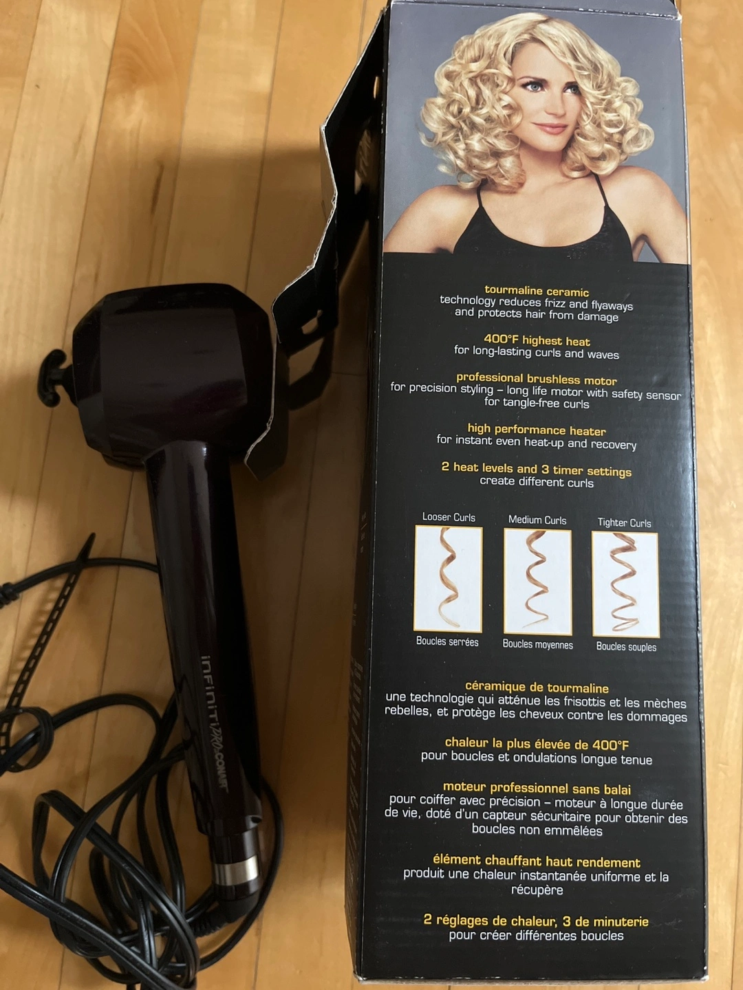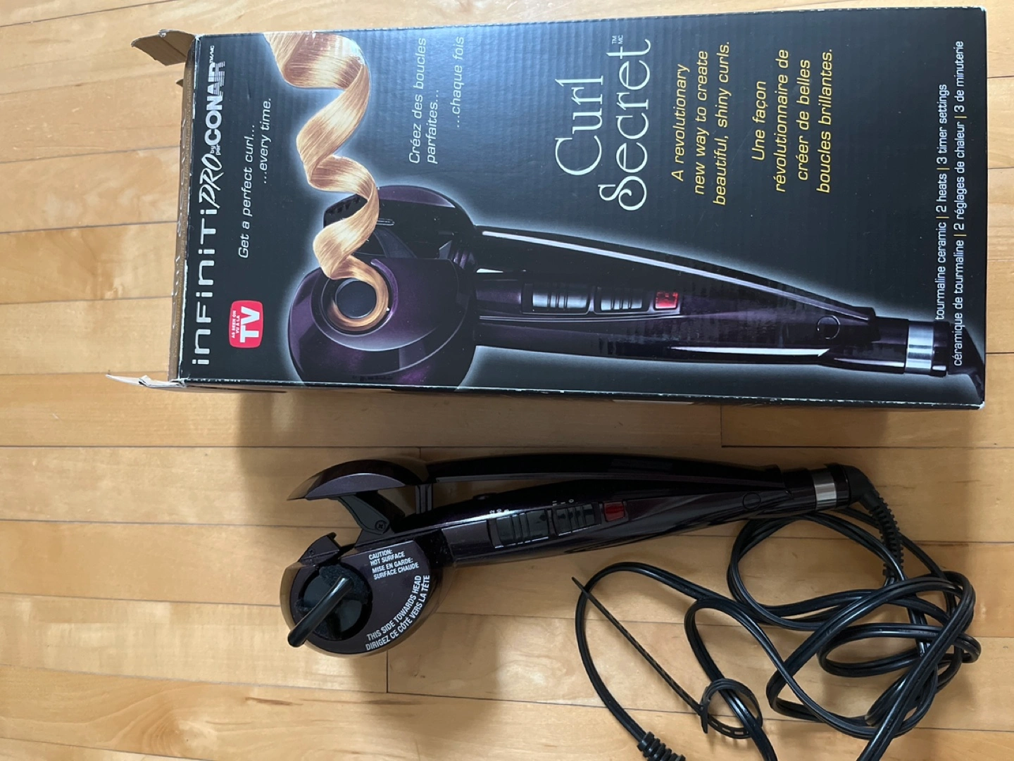 Automatic curling iron. Features tourmaline ceramic technology. Three heat settings and three timer settings. Includes a swivel cord. Like new, used only twice.