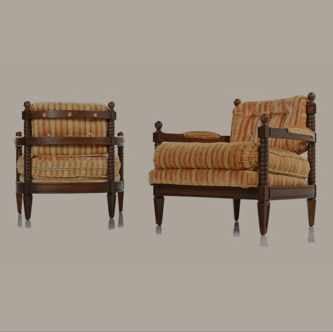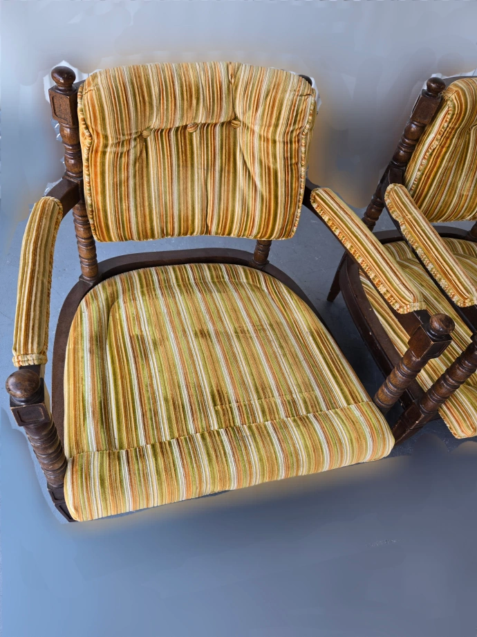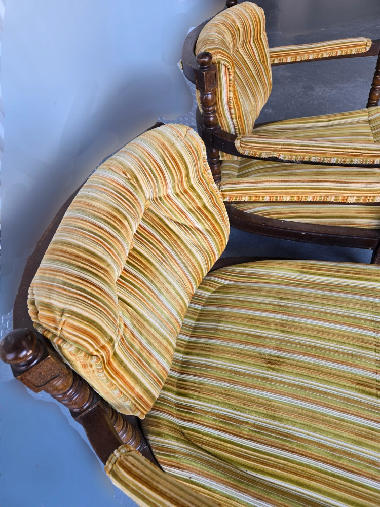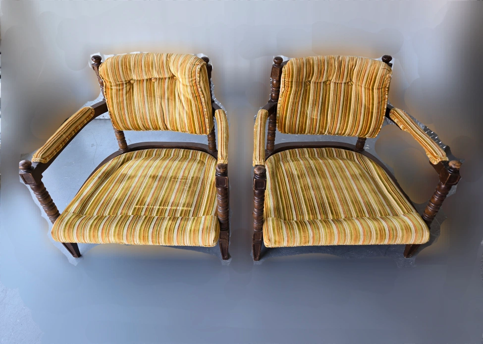 Set of two armchairs. Wood frame. Striped upholstery. Vintage style. Perfect for a retro living room. Spanish Mediterranean Style Original Striped Velour Lounge Chair Set.