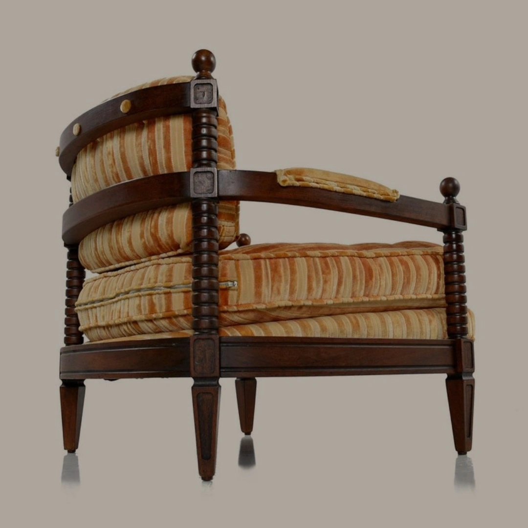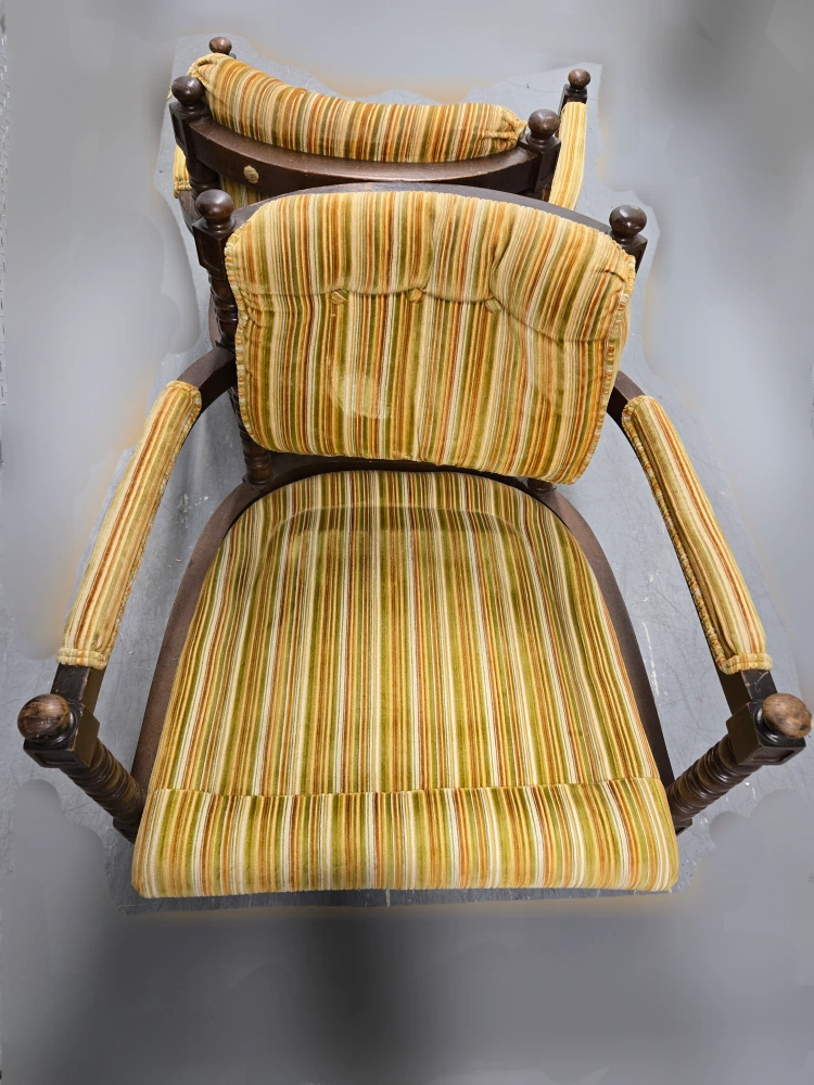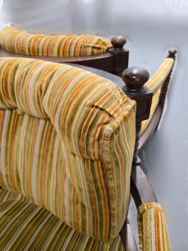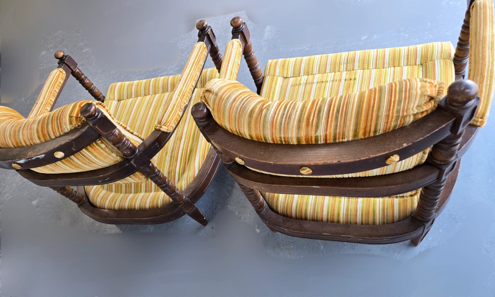 Set of two armchairs. Wood frame. Striped upholstery. Vintage style. Perfect for a retro living room. Spanish Mediterranean Style Original Striped Velour Lounge Chair Set.