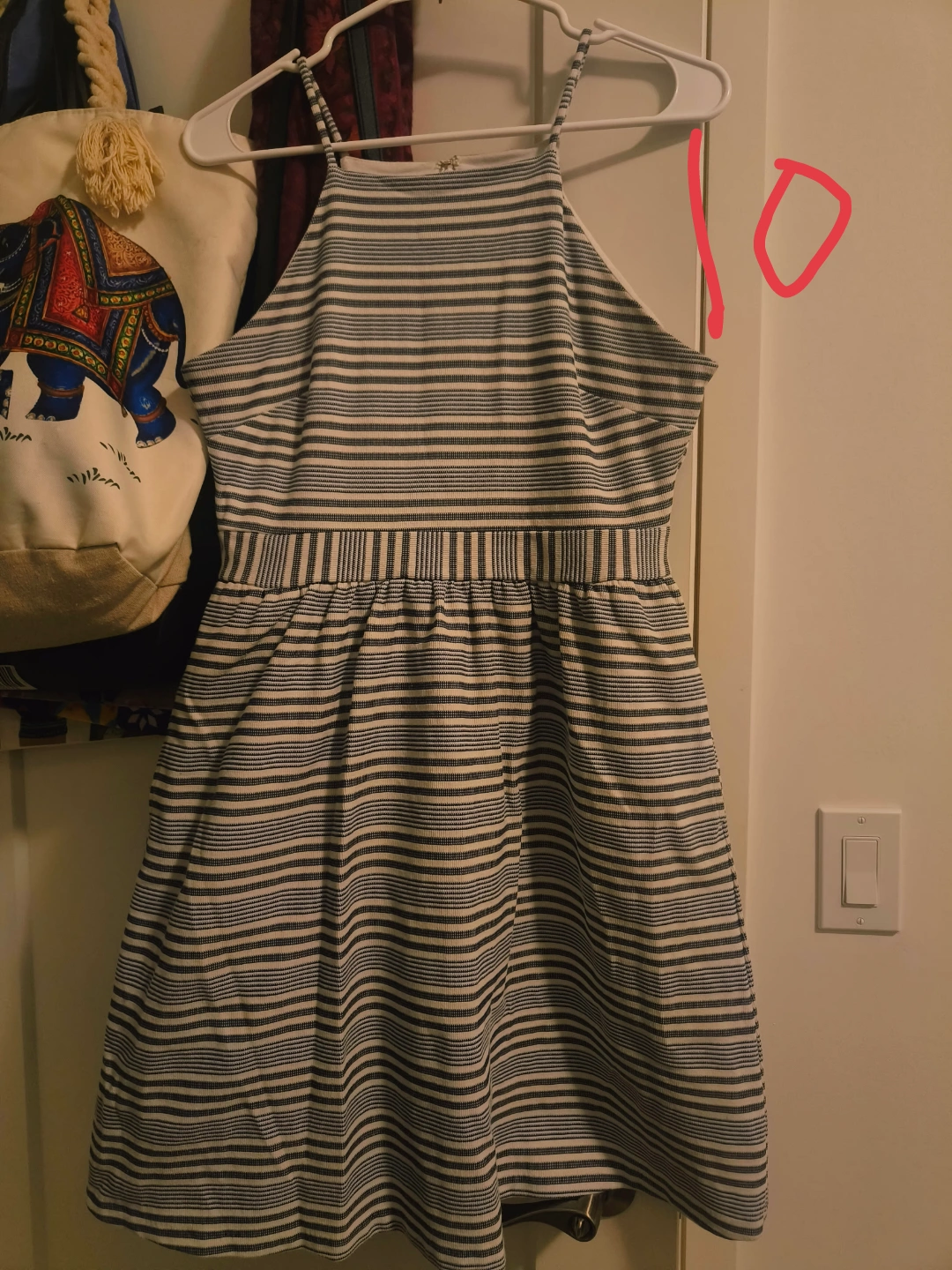 Adorable summer dress. Features a halter neck and a striped pattern. Lightweight and flowy. Perfect for warm weather.