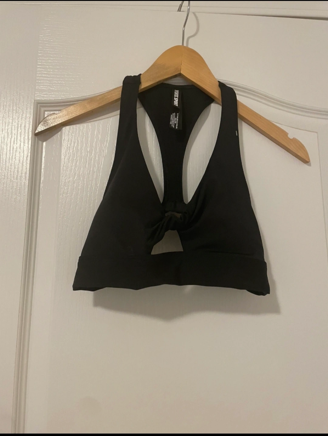 Black sports bra. Knotted detail at the centre. Racerback style. Great for Pilates or other workouts.