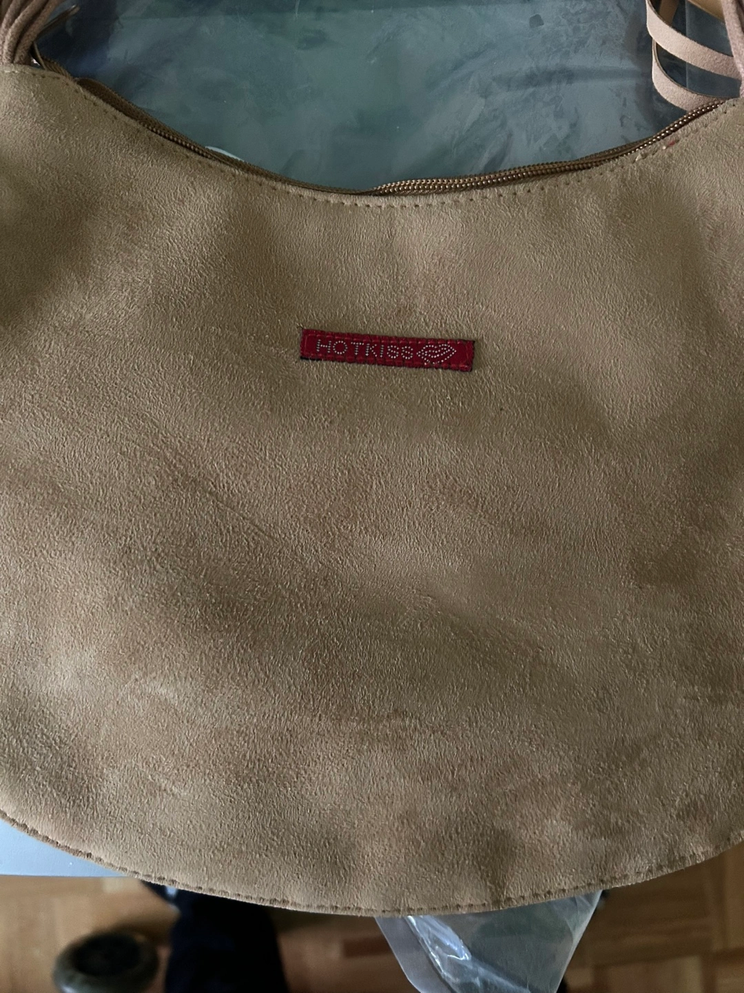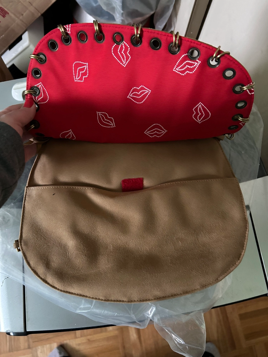 Hot Kiss Tan Suede Shoulder Bag with Red Lip Interior