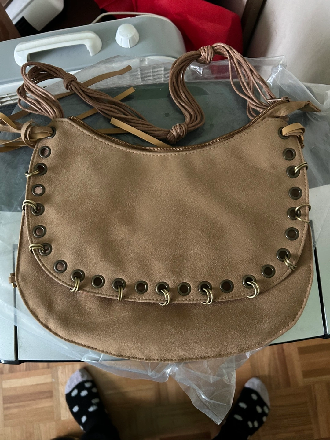Unique tan suede handbag. Features a red interior with a lip print. Adjustable shoulder strap. Metal eyelets and zipper closure. Great for everyday use.