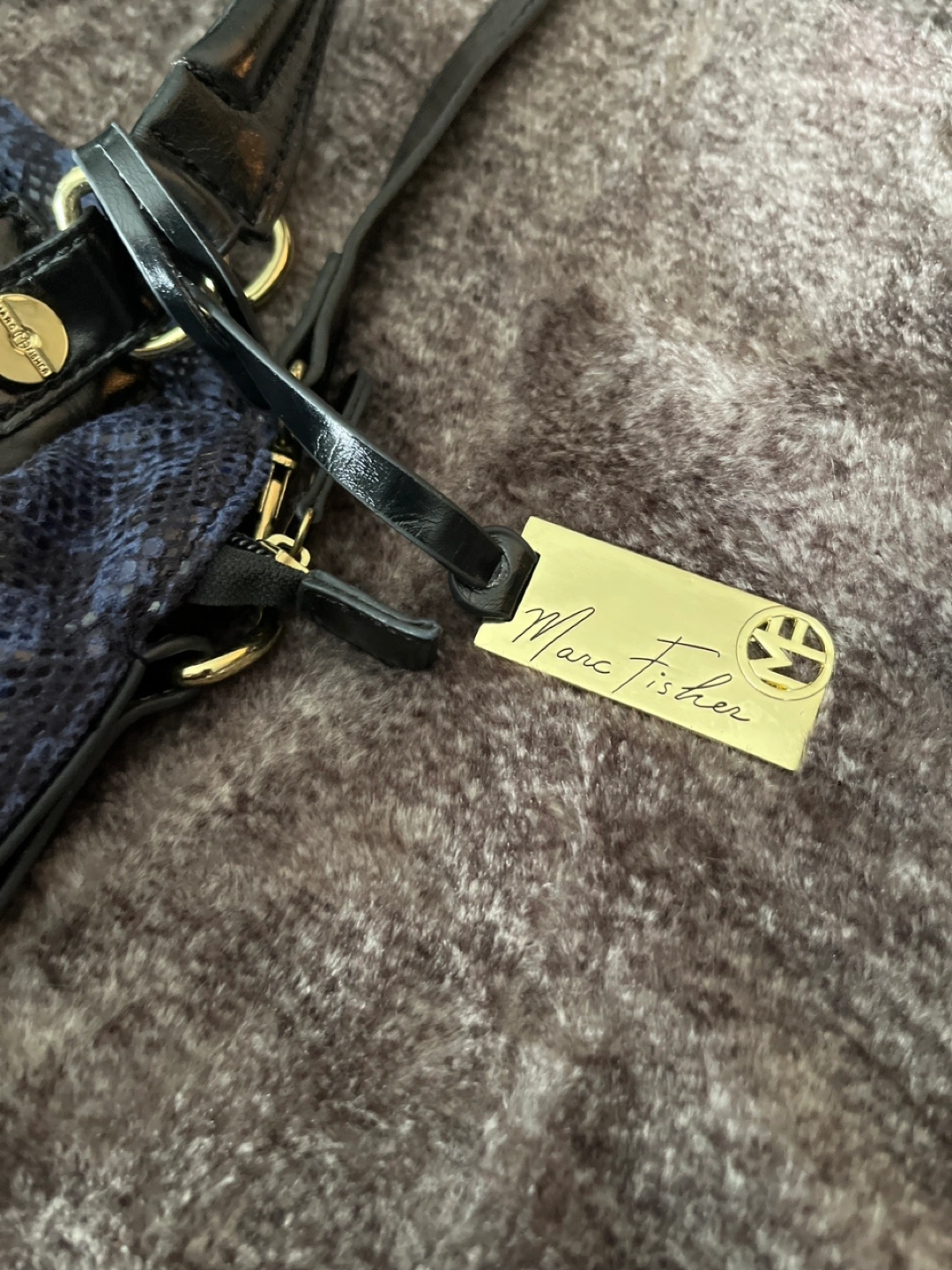 Beautiful Marc Fisher handbag. Blue snakeskin pattern. Features a top handle and a detachable shoulder strap. Interior zip pocket. Gold-toned hardware.