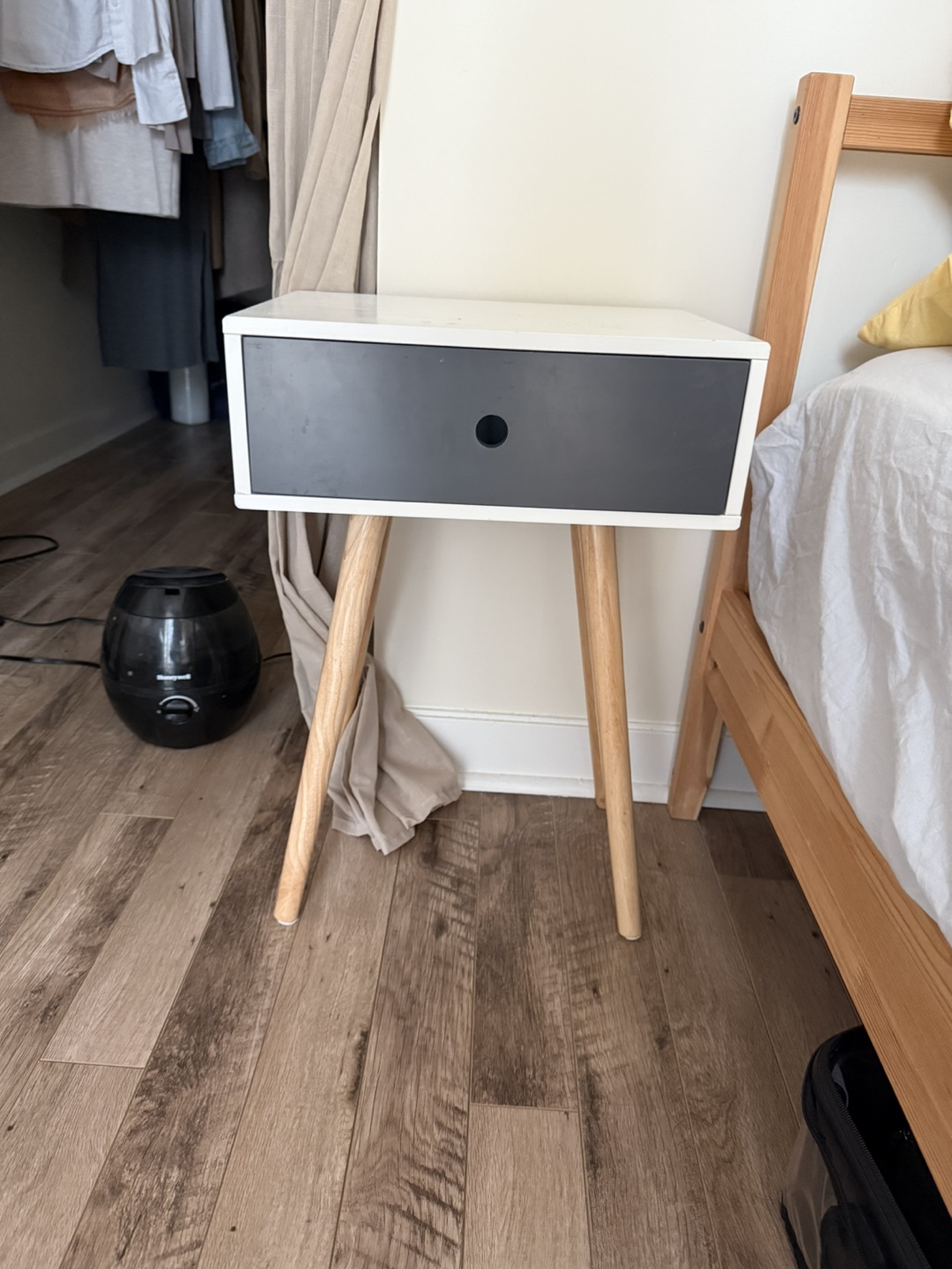 Cute nightstand, perfect for a small space. Features one drawer and light wood legs. Minimalist style.
