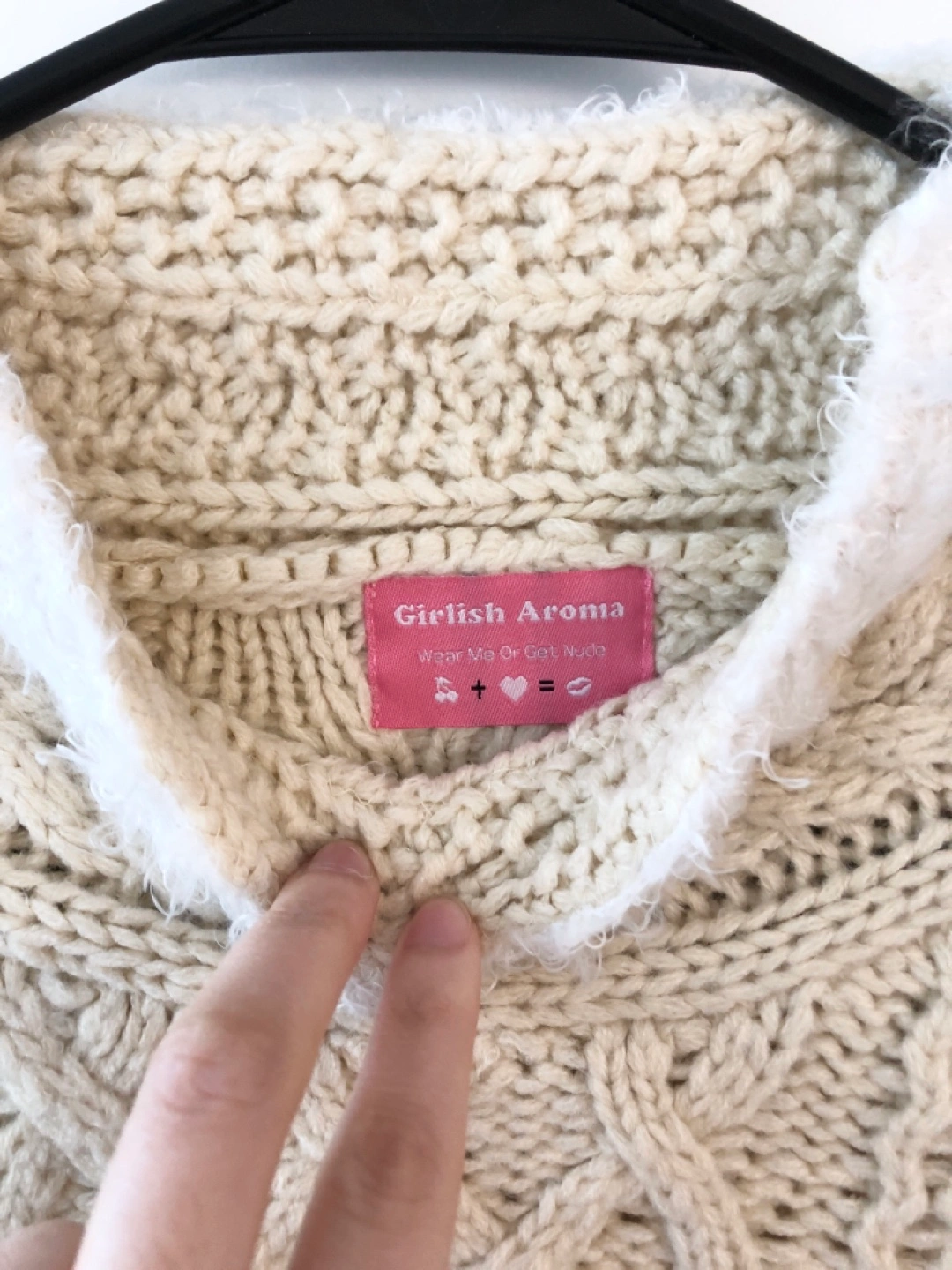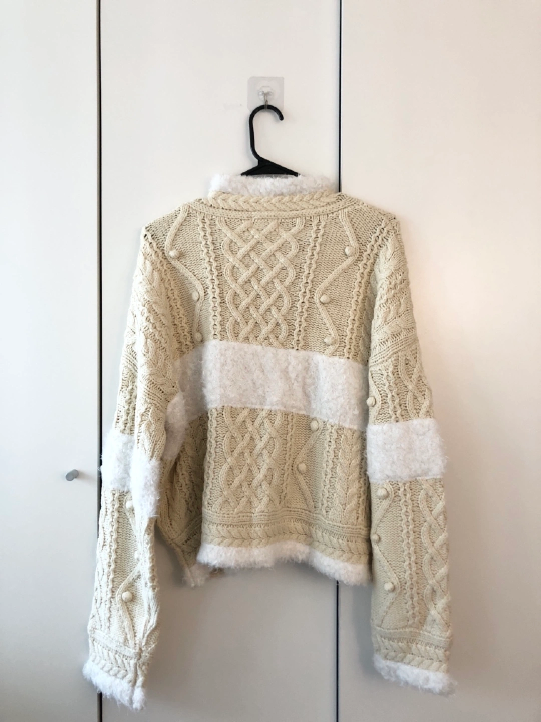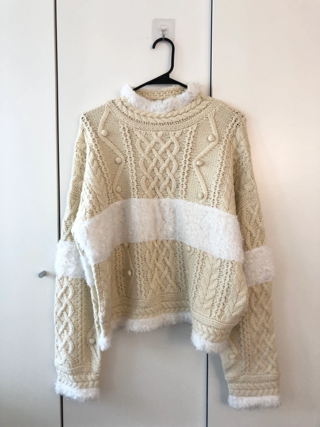 Cream coloured cable knit sweater. Features fluffy white trim. Adorable details. Relaxed fit. Long sleeves. Mock neck.
