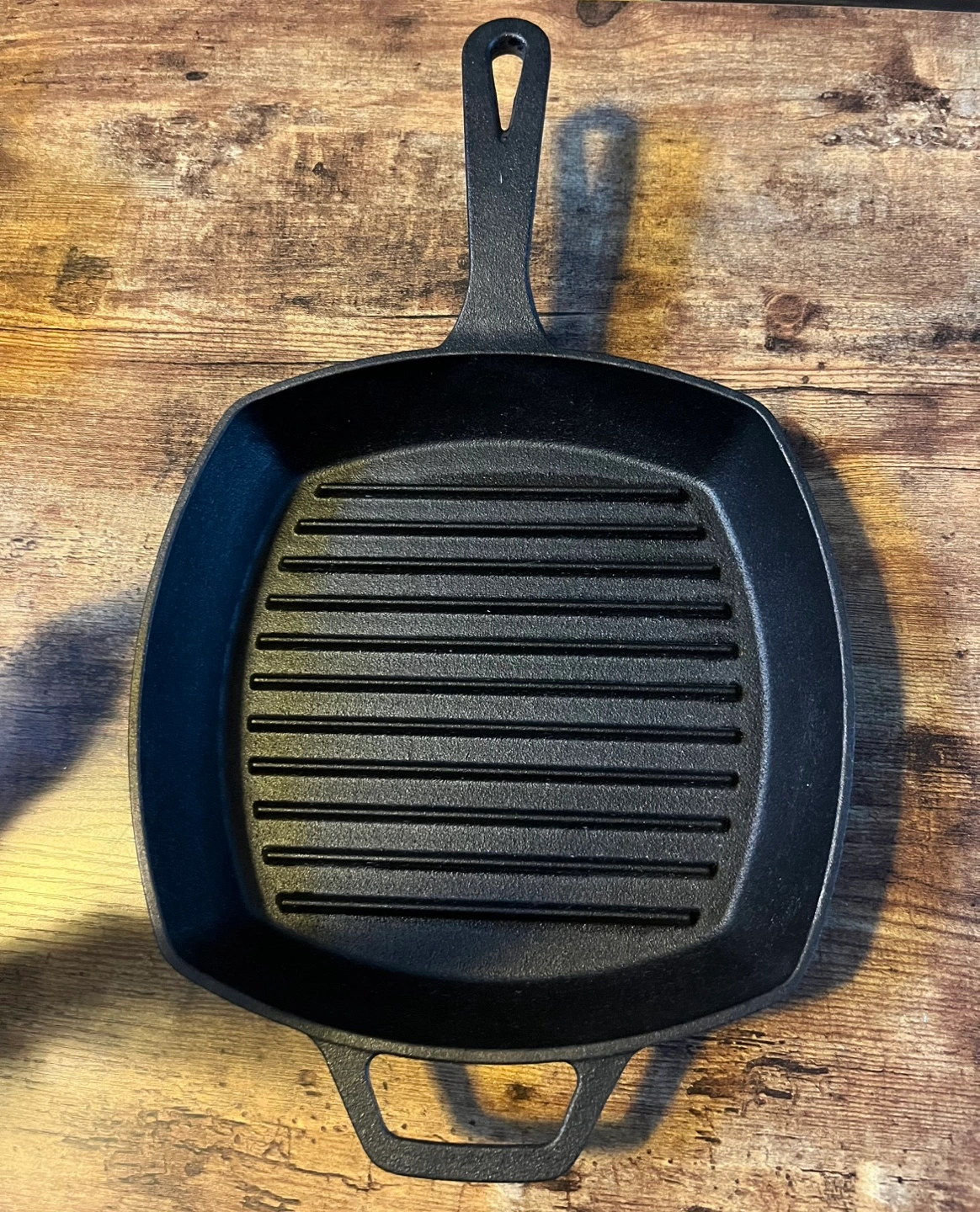 Square cast iron grill pan. Features raised grill lines. Long handle. Great for searing meats and vegetables. Brand New - never used