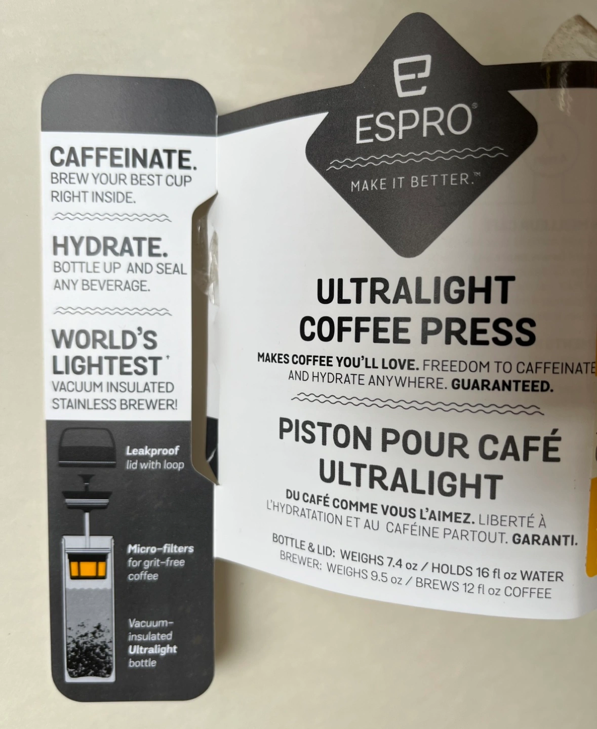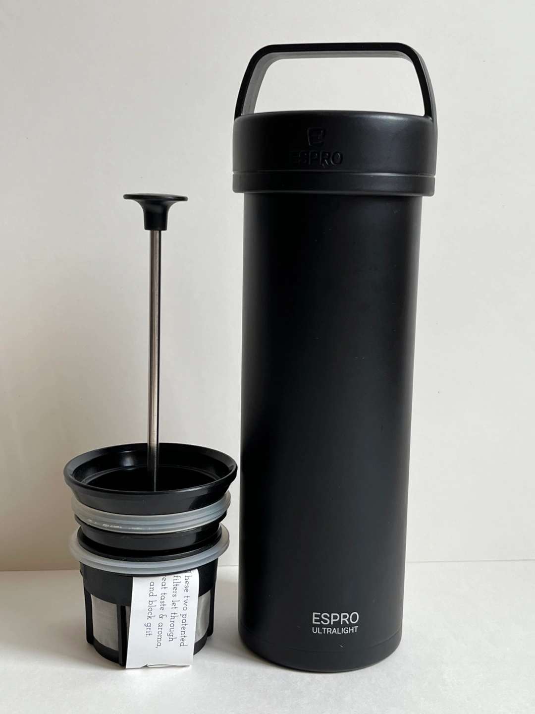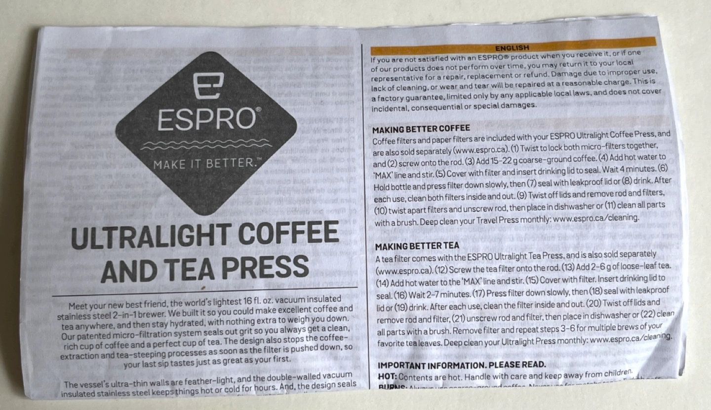 Vacuum insulated stainless steel. Double-walled vacuum keeps drinks hot or cold. Patented micro-filtration system. Includes filters. Weighs 7.4oz. Holds 16 oz. capacity. In very good condition. If ad is up, the item is available.