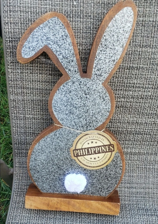 Adorable wooden rabbit figurine. Handcrafted in the Philippines. Features a simple design, perfect for Easter or year-round decor. Stands on a small wooden base.