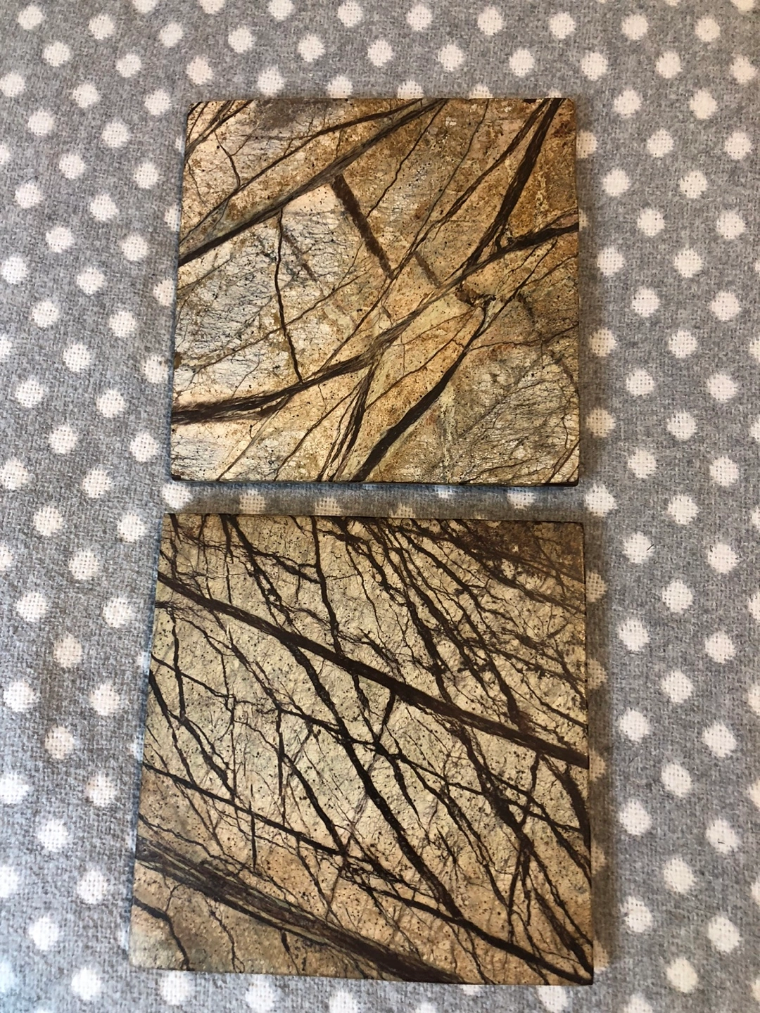 Set of two square coasters. Natural stone, brown and green marble pattern. Perfect for drinks or decor.