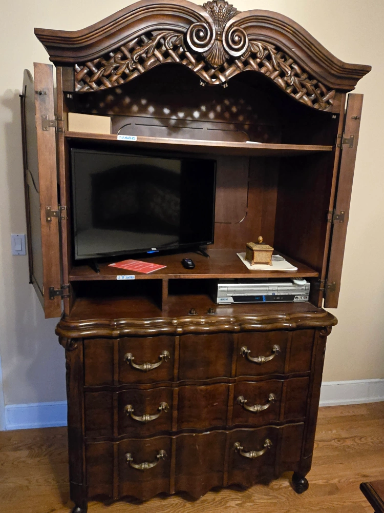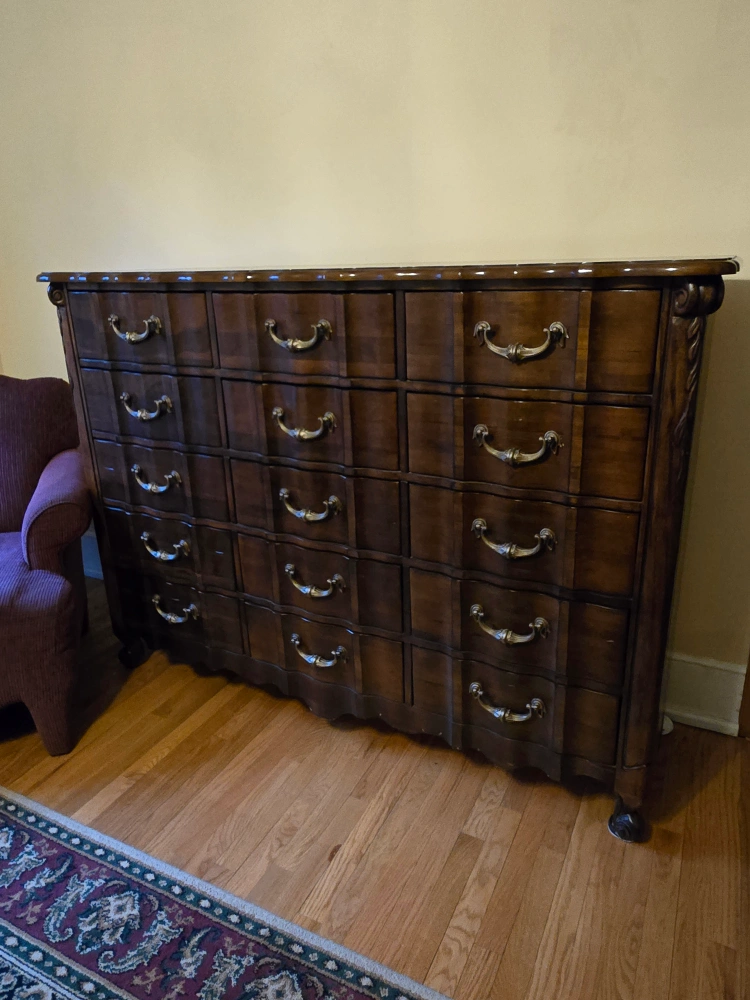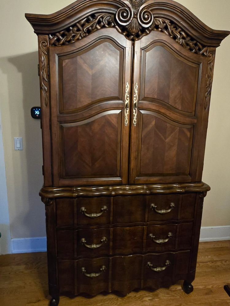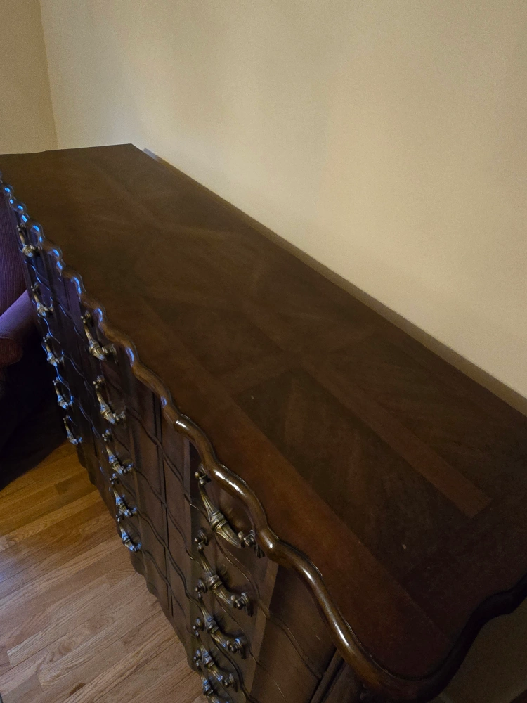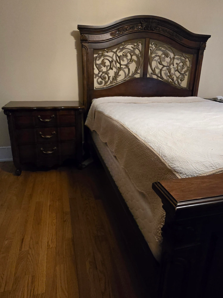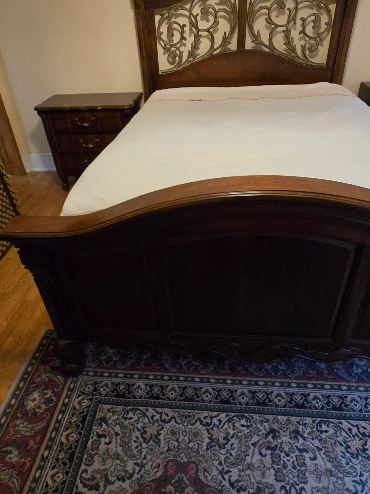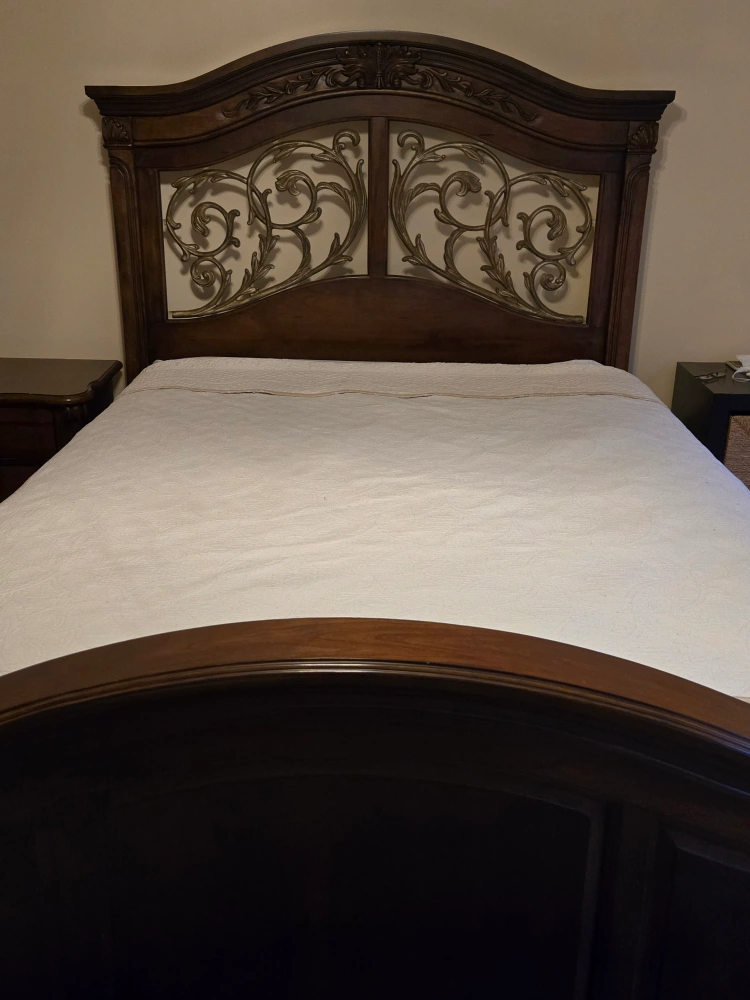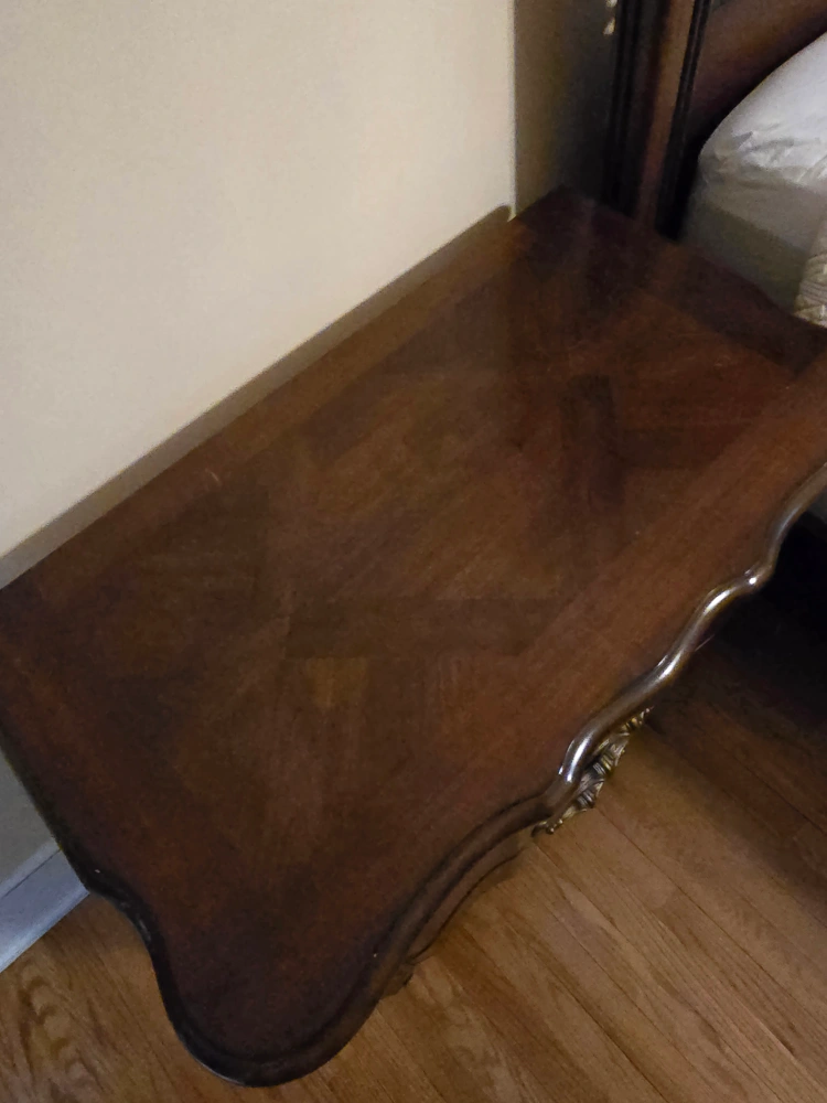 Ornate detailing. Normal wear. Beautiful bedroom furniture.