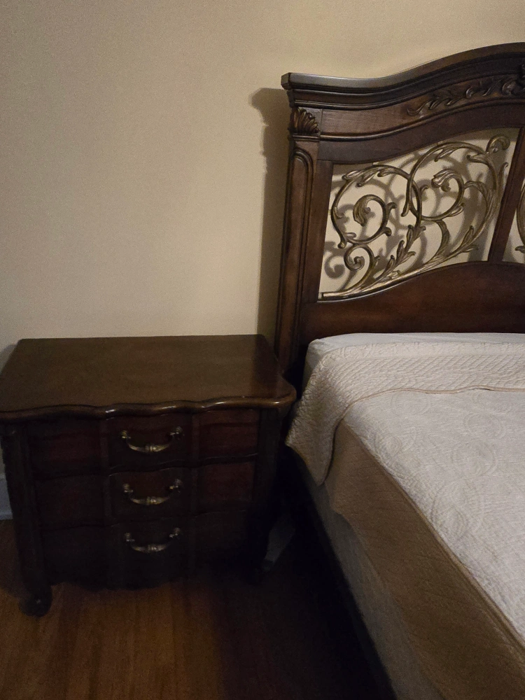Dark brown bedroom set. Queen size bed, matching nightstand with three drawers.