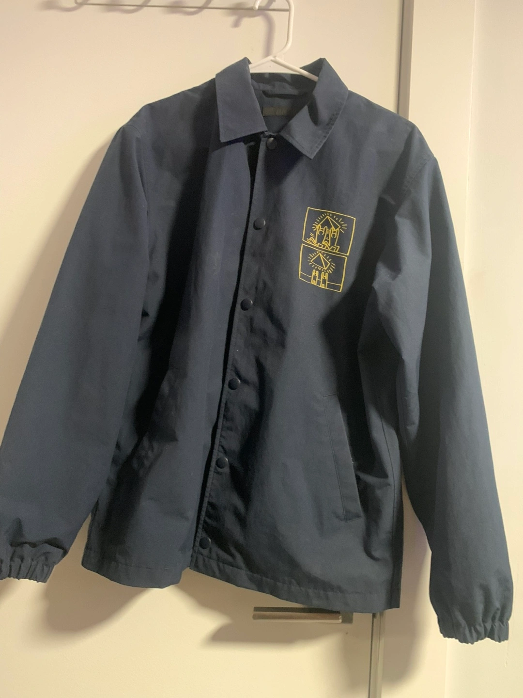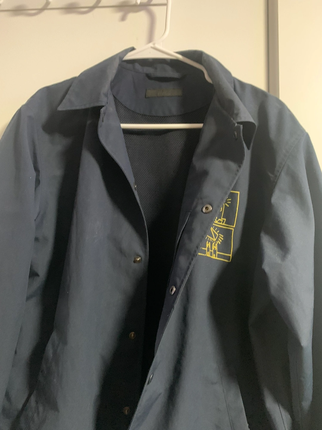 Navy blue coaches jacket. Features a Keith Haring design on the back. Mesh lining. Snap button closure. Great condition.