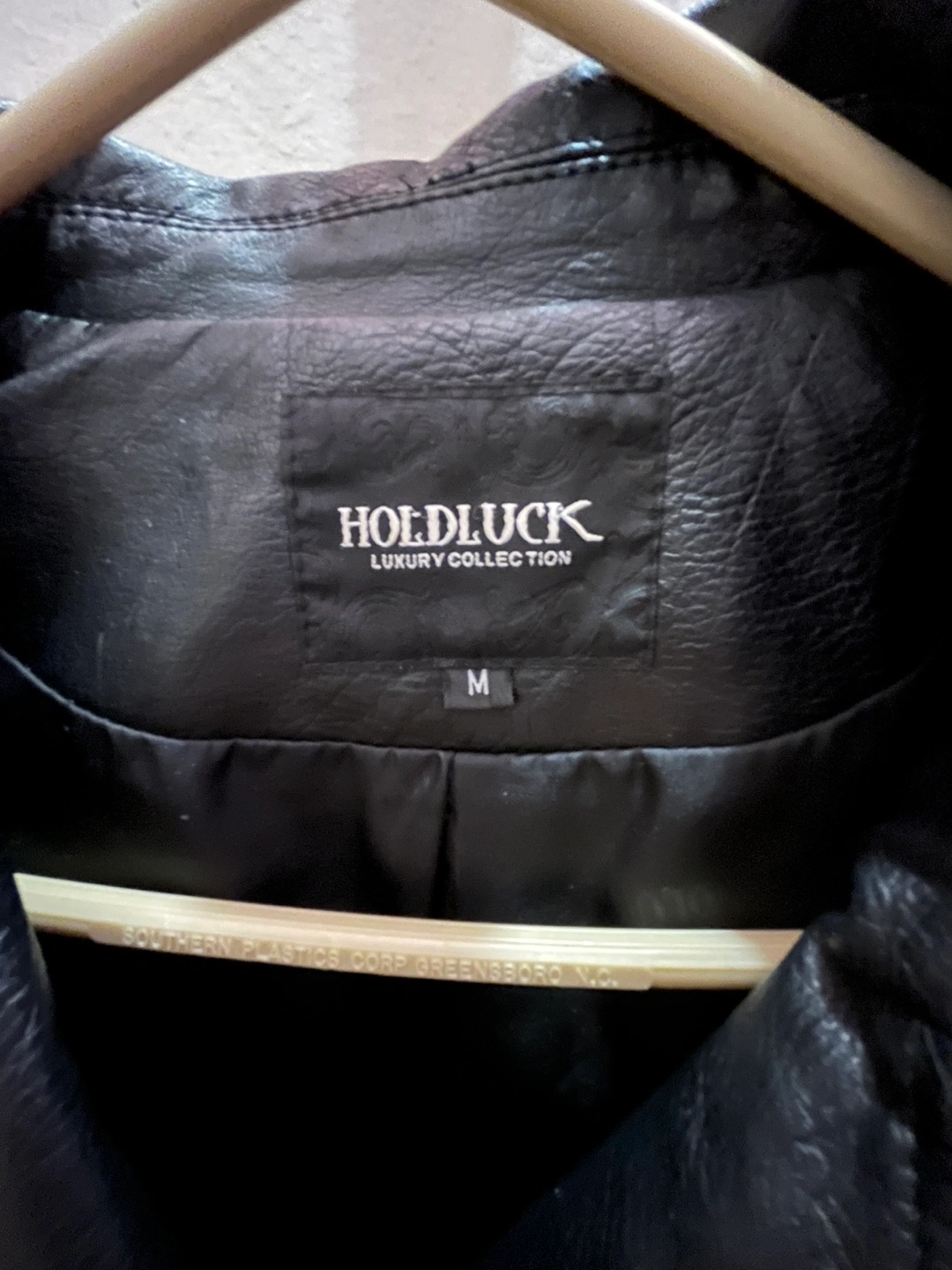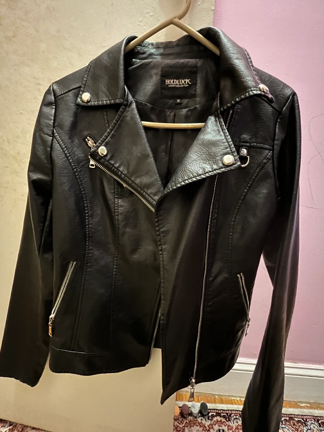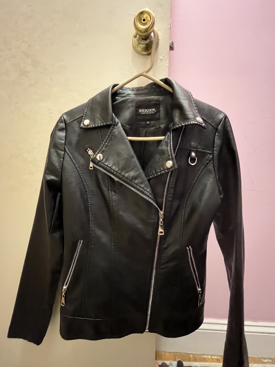 Women's black faux leather moto jacket. Size Medium. Asymmetrical zipper closure. Multiple pockets. Sleek and stylish.