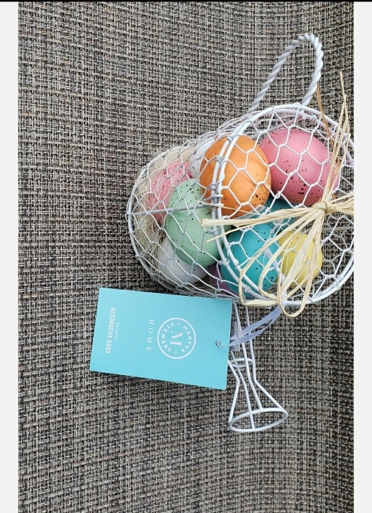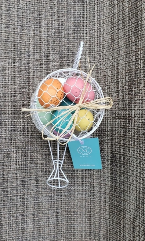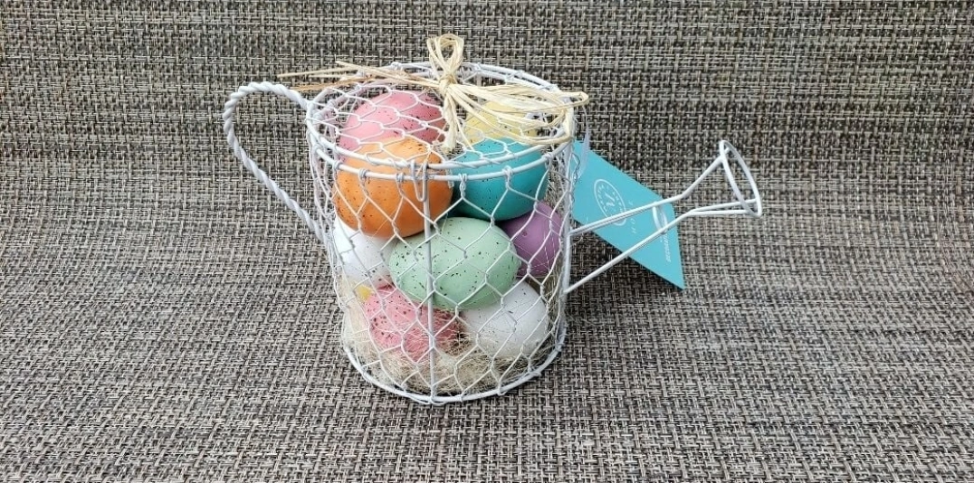 Charming white metal watering can filled with pastel speckled eggs. Perfect spring or Easter decoration. New with tag.