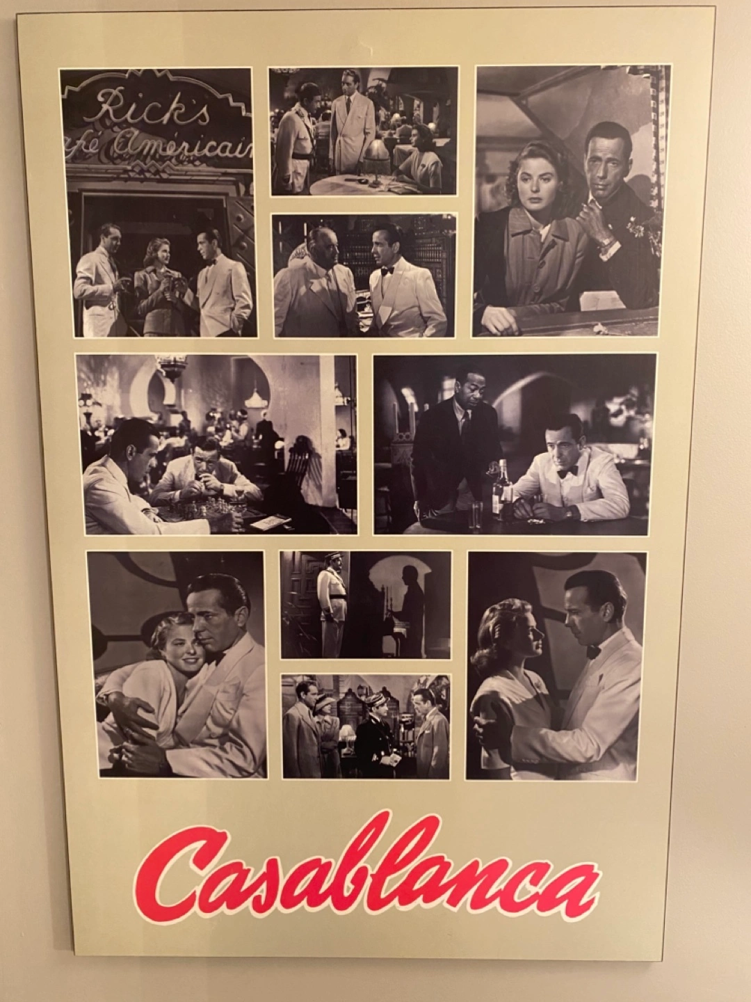 Black/white collage of pictures from the classic movie “Casablanca” starring Humphrey Bogart and Ingrid Bergman.