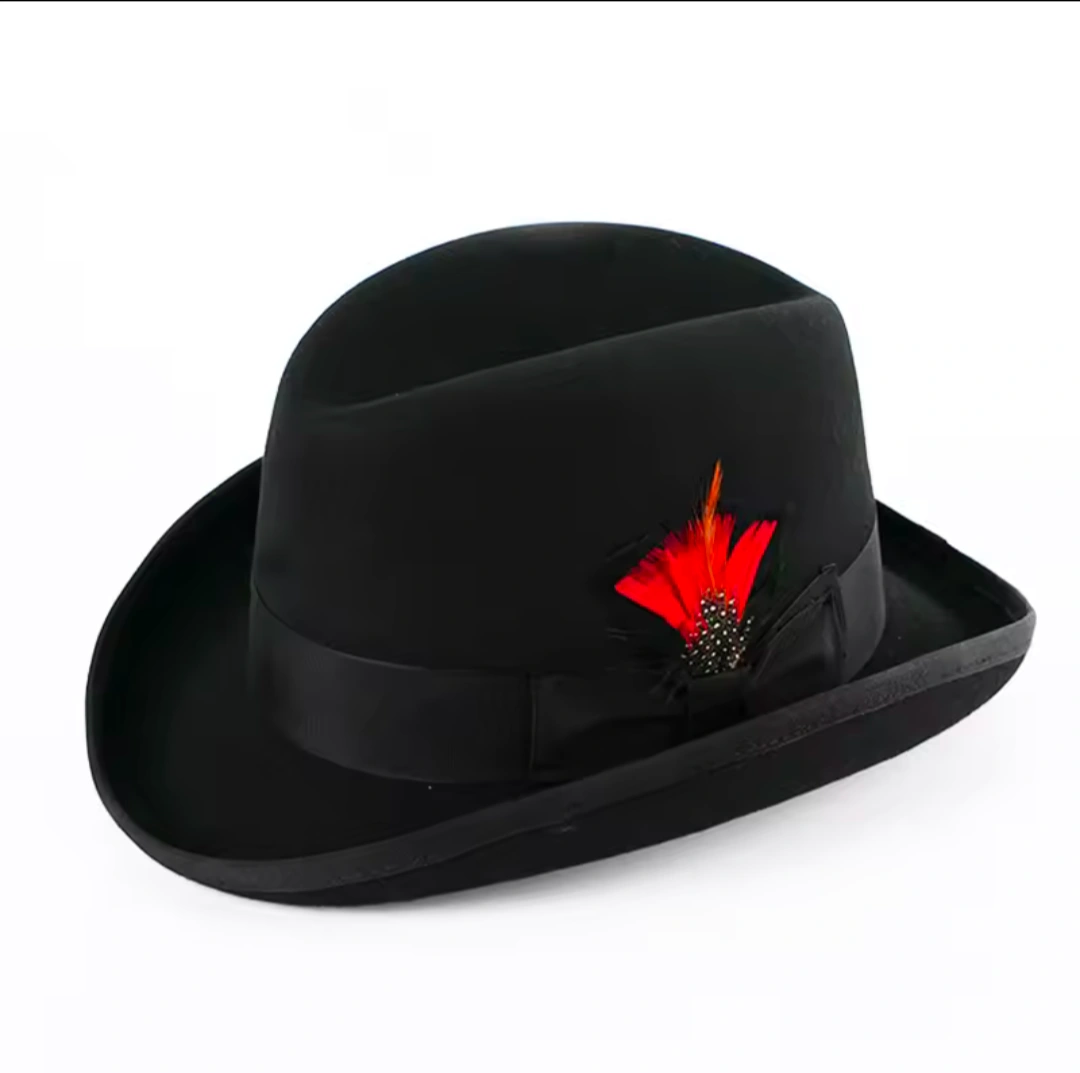 100% Wool Black Fedora Homburg Hat with removable Feather