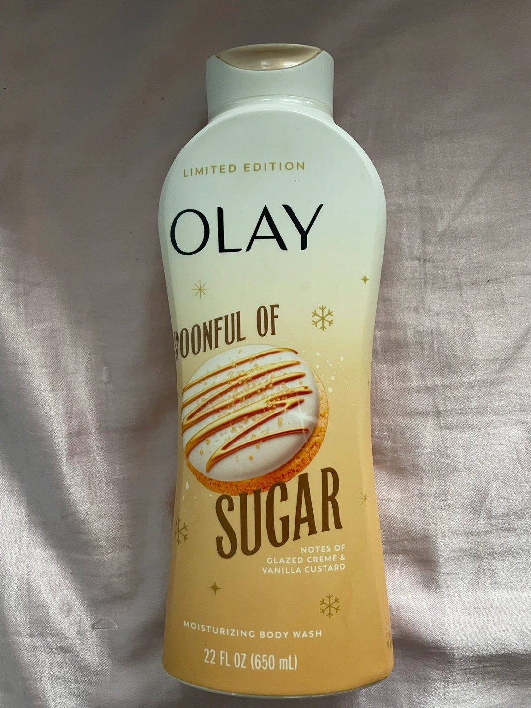 This is Olay's limited edition "A Spoonful of Sugar" moisturizing body wash. It has notes of glazed crème and vanilla custard. The bottle contains 22 fl oz (650 mL).
